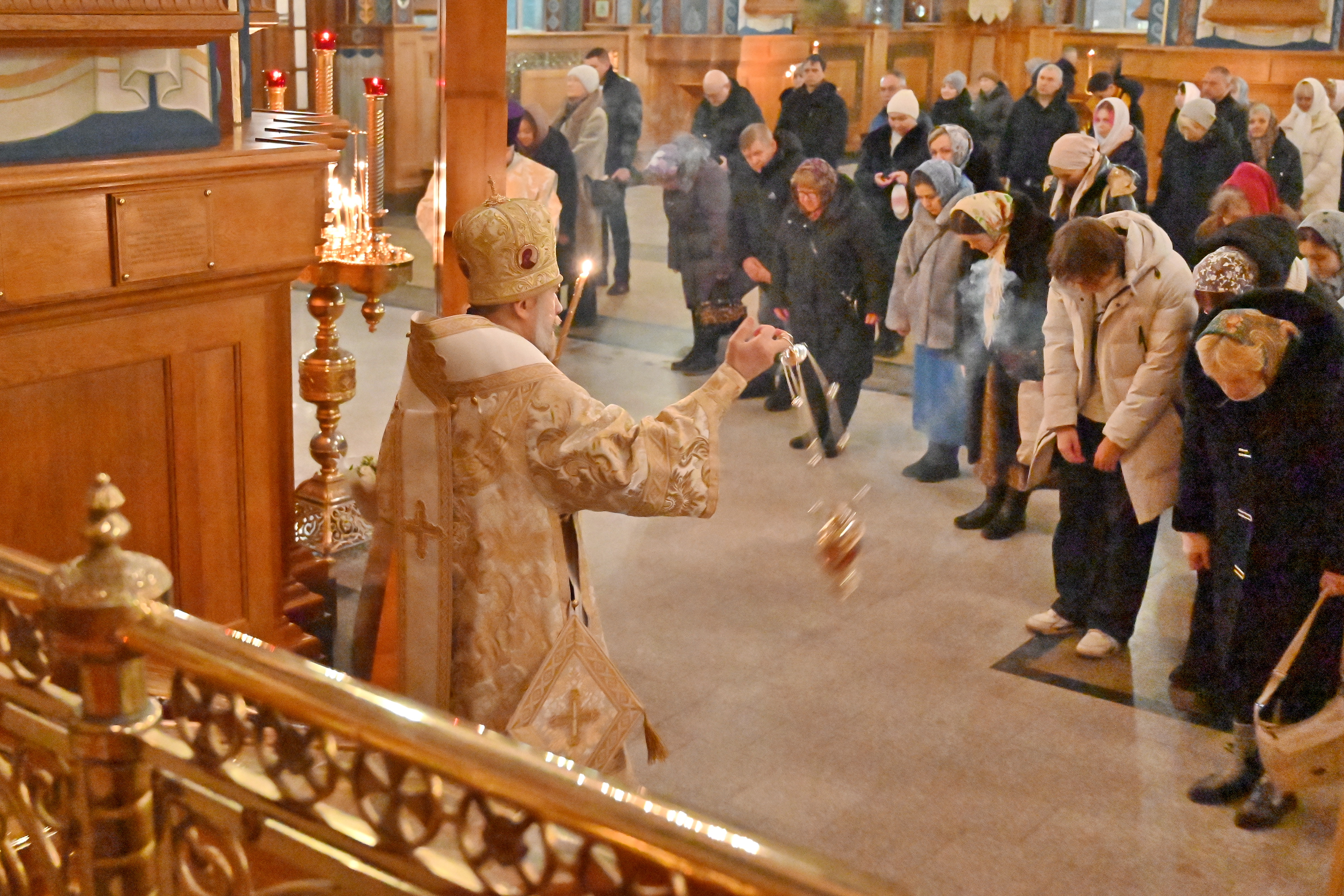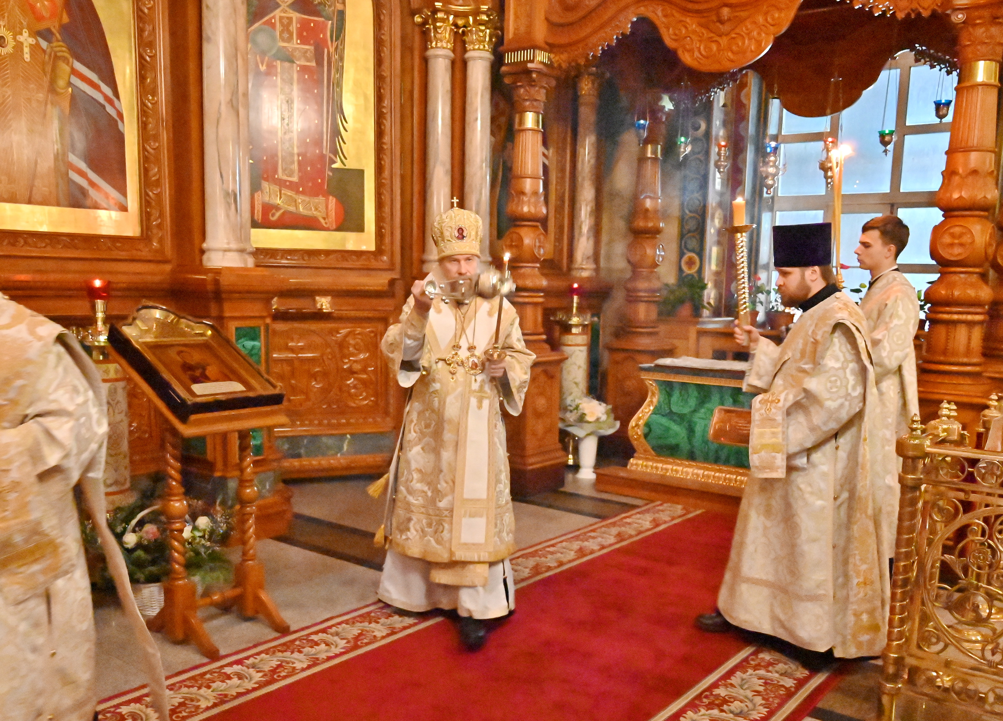 При совершении полиелея, во время пения тропарей воскресных по Непорочных "Ангельский собор удивися", митрополит Леонтий совершил полное каждение храма. После степенных антифонов октоиха и воскресного прокимна 8 гласа Владыка возгласил 11-е воскресное евангельское зачало о явлении воскресшего Господа ученикам (Ин., 67 зач., XXI, 15-25).