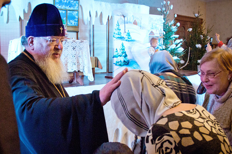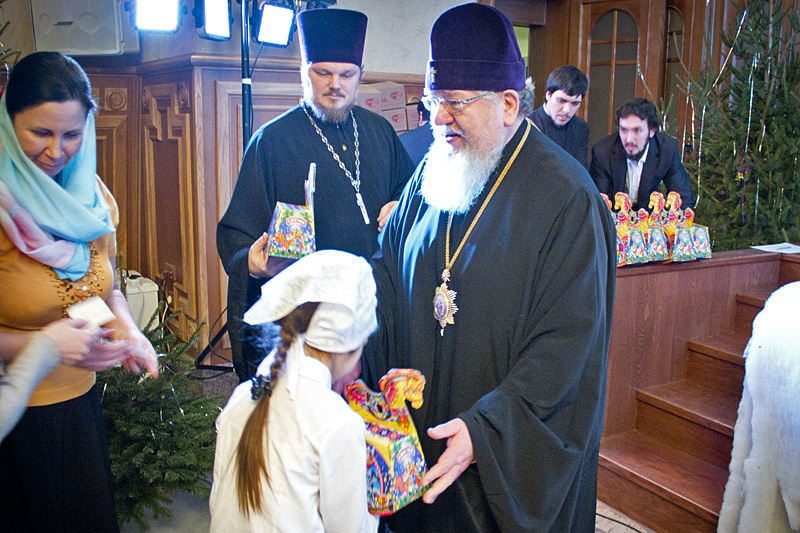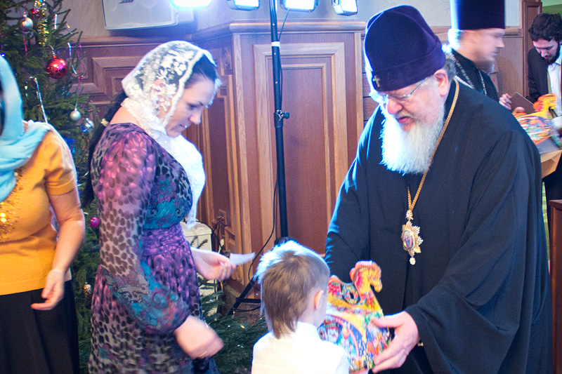 В завершение праздника все юные артисты — участники концерта, каковыми были все воспитанники воскресной школы — получили из рук Высокопреосвященнейшего Владыки Сергия по узорчатой декоративной коробке-лошадке, наполненной сладостями.