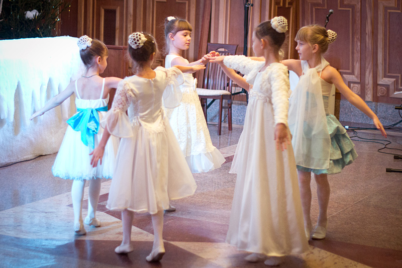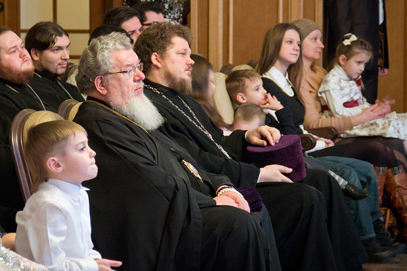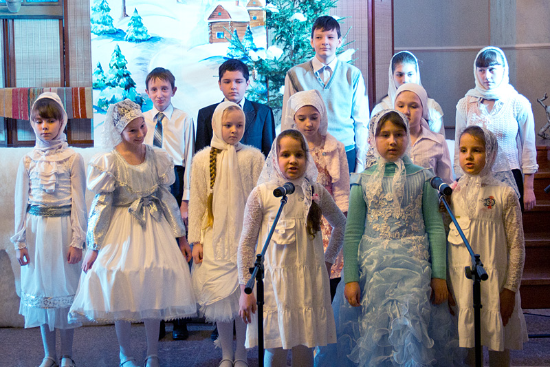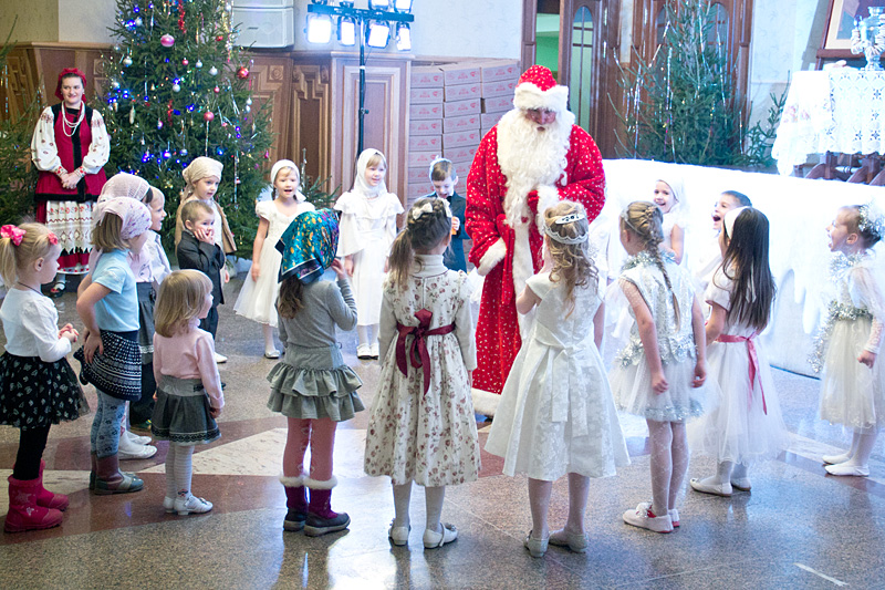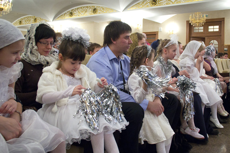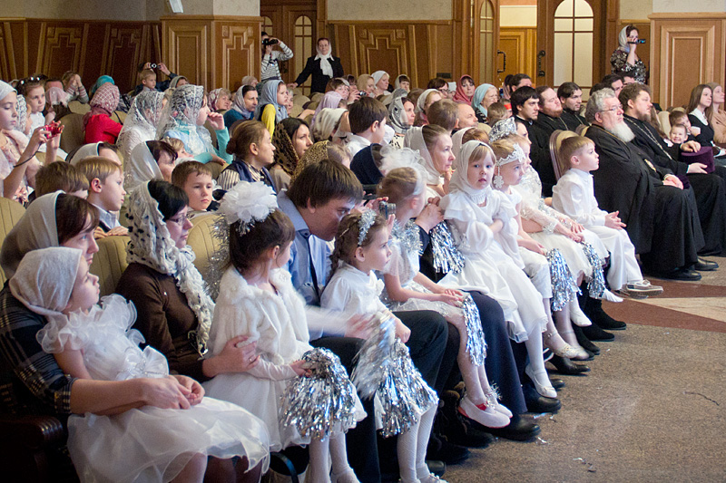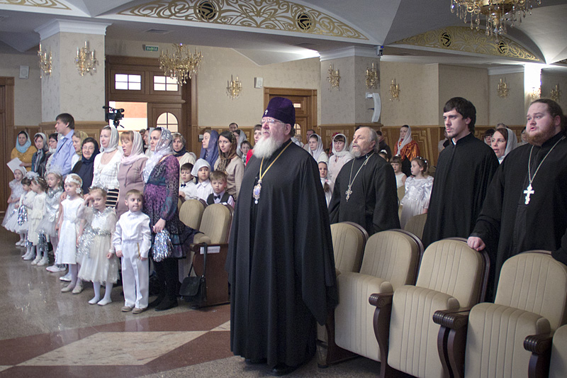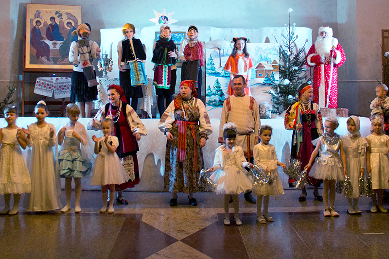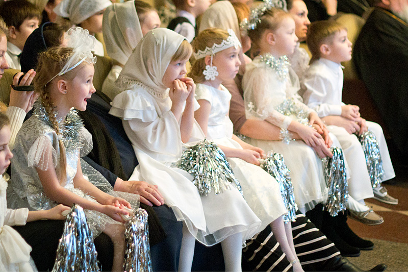 Затем Дед Мороз — он же Морозко — провел с детьми веселые хороводы и конкурсы. Детский хор исполнил праздничные песнопения, а затем в исполнении «эстафеты» чтецов прозвучала стихотворная «Детская молитва».