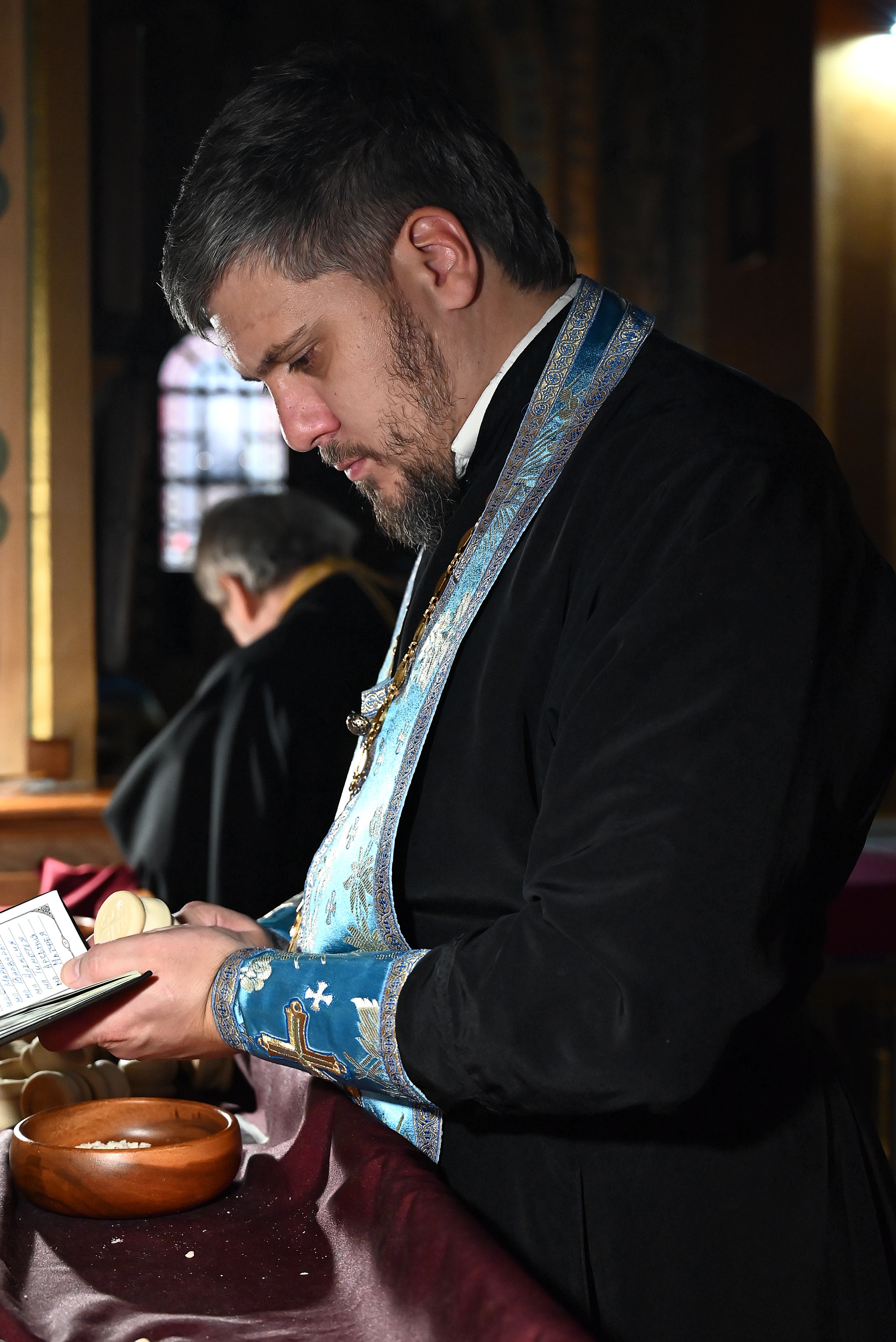 В притворе храма отец Павел совершил чин литии и благословение пяти хлебов, пшеницы, вина и елея.