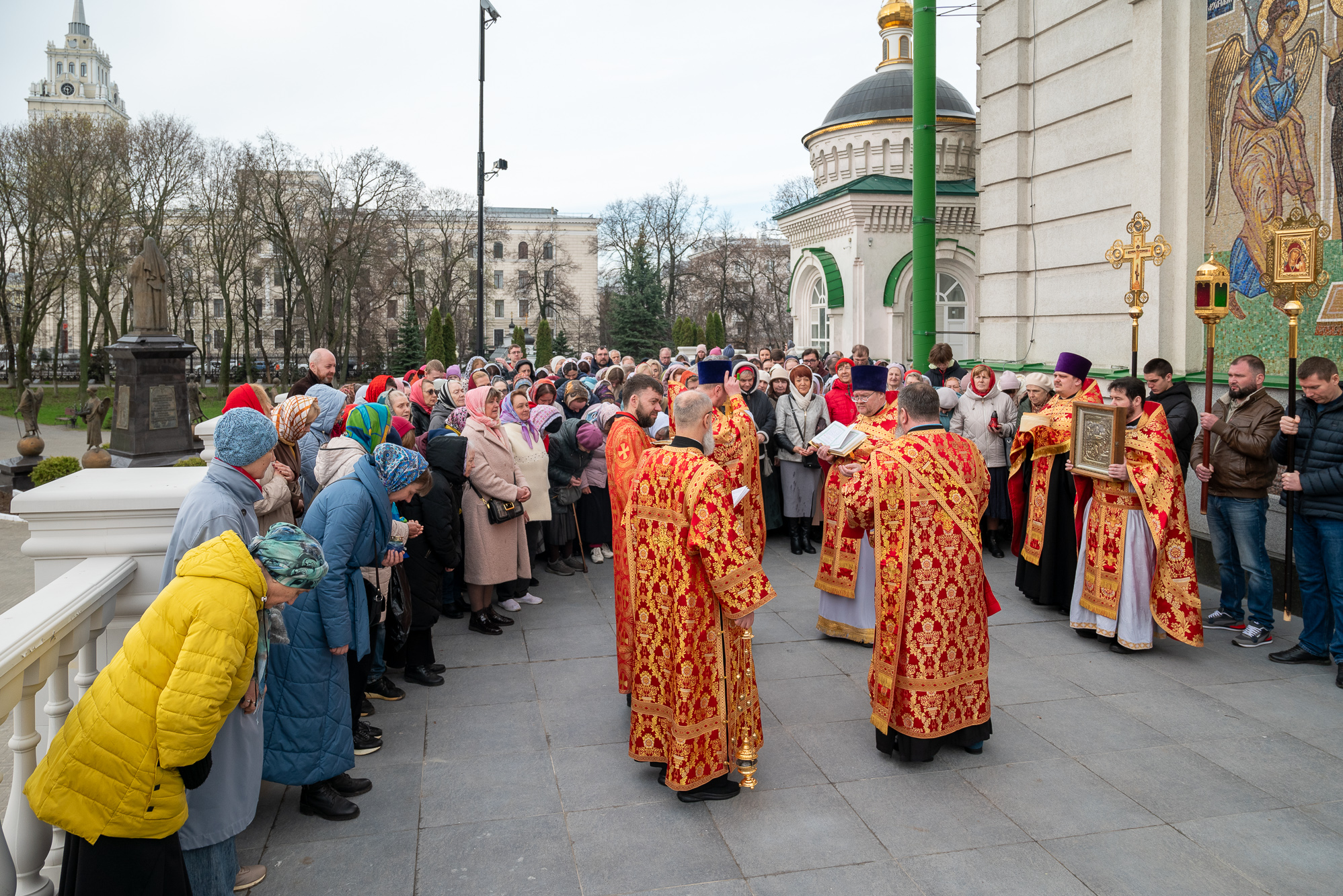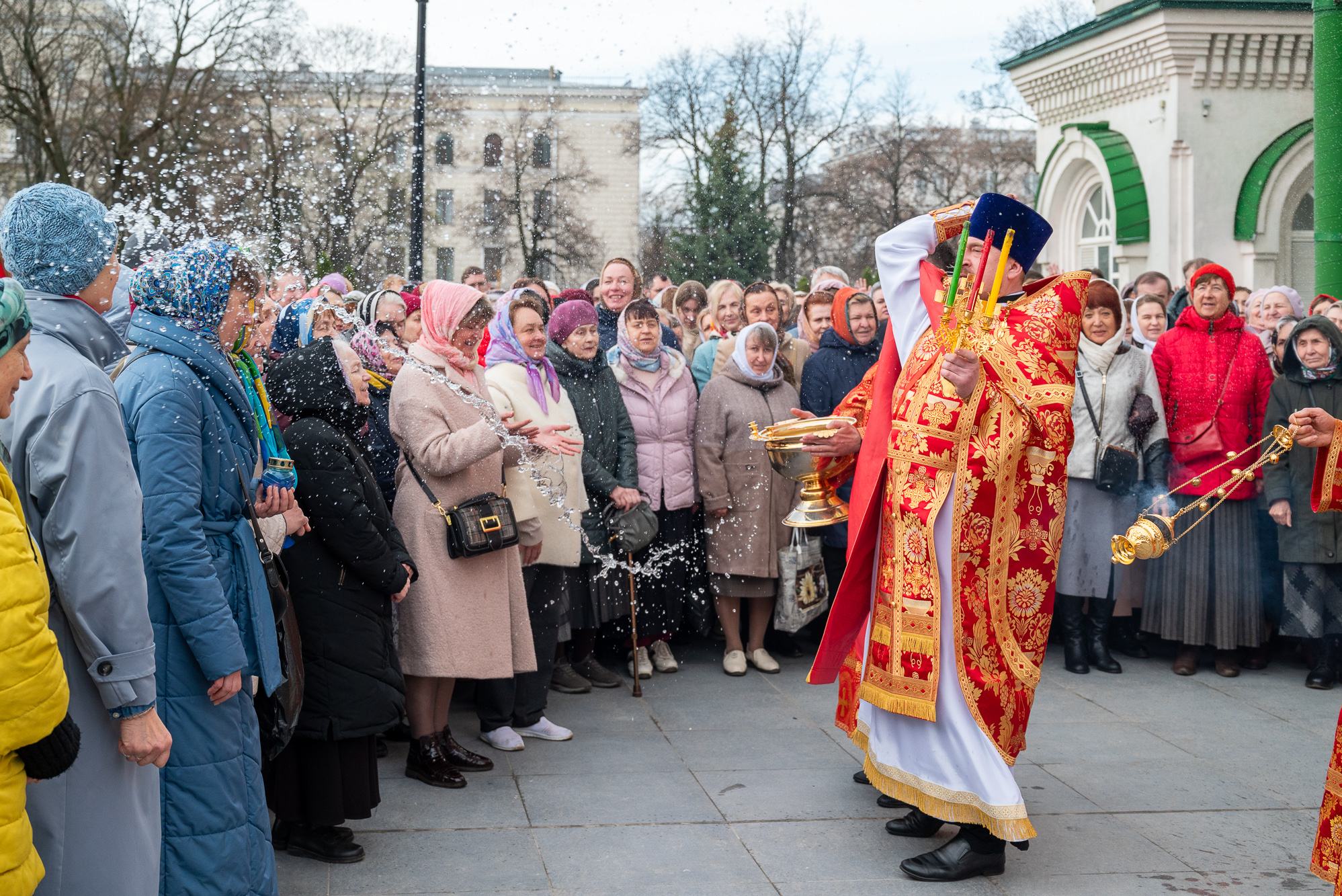 По заамвонной молитве, духовенство, вместе с народом, совершили Крестный ход вокруг храма. Крестное шествие совершило четыре остановки, во время которых молящиеся осенялись крестом и окроплялись Святой водой.