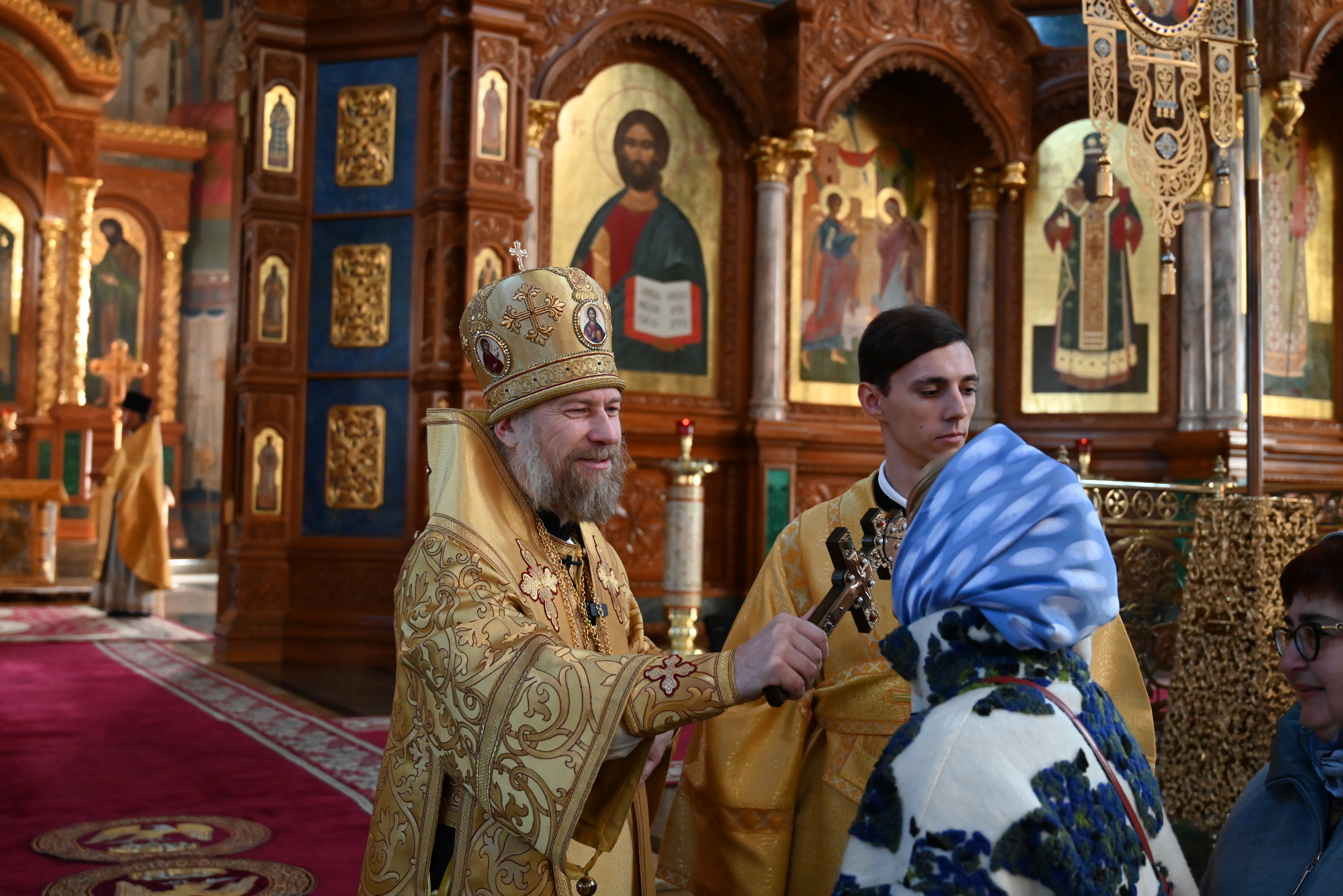 Во время чтения благодарственных молитв по Святом Причащении Архипастырь преподал молящимся крест для лобызания.