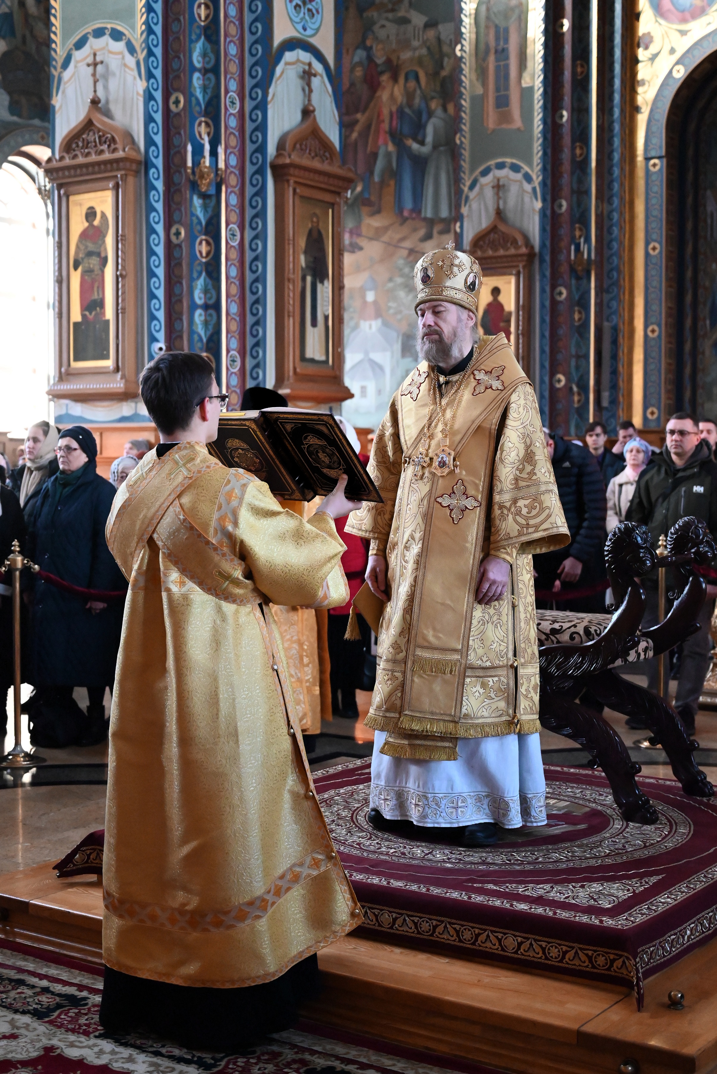 На сугубой ектении были произнесены особые прошения: "...о еже прияти молитвы нас недостойных рабов Твоих в сию годину испытания..." и прошение о "Преосвященных архипастырях, пастырях, монашествующих и мирянах земли Украинския, о единстве Церкви Христовы ревнующих, в заточении и гонениях сущих". Затем митрополит Леонтий вознес молитву о Святой Руси. По благословению Святейшего Патриарха Московского и всея Руси Кирилла эта молитва читается во всех храмах Русской Православной Церкви.