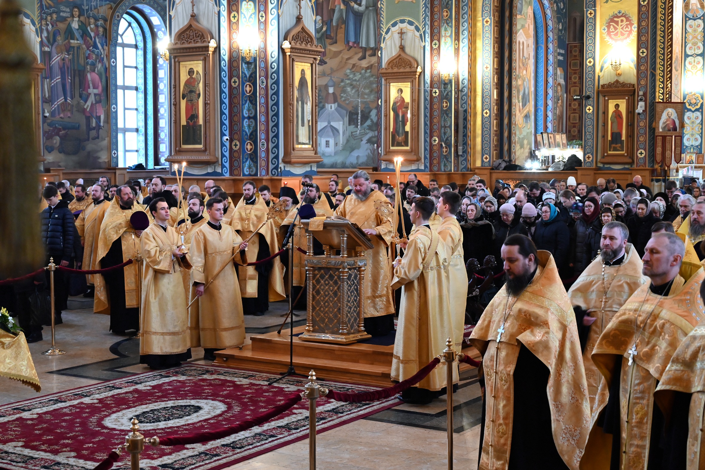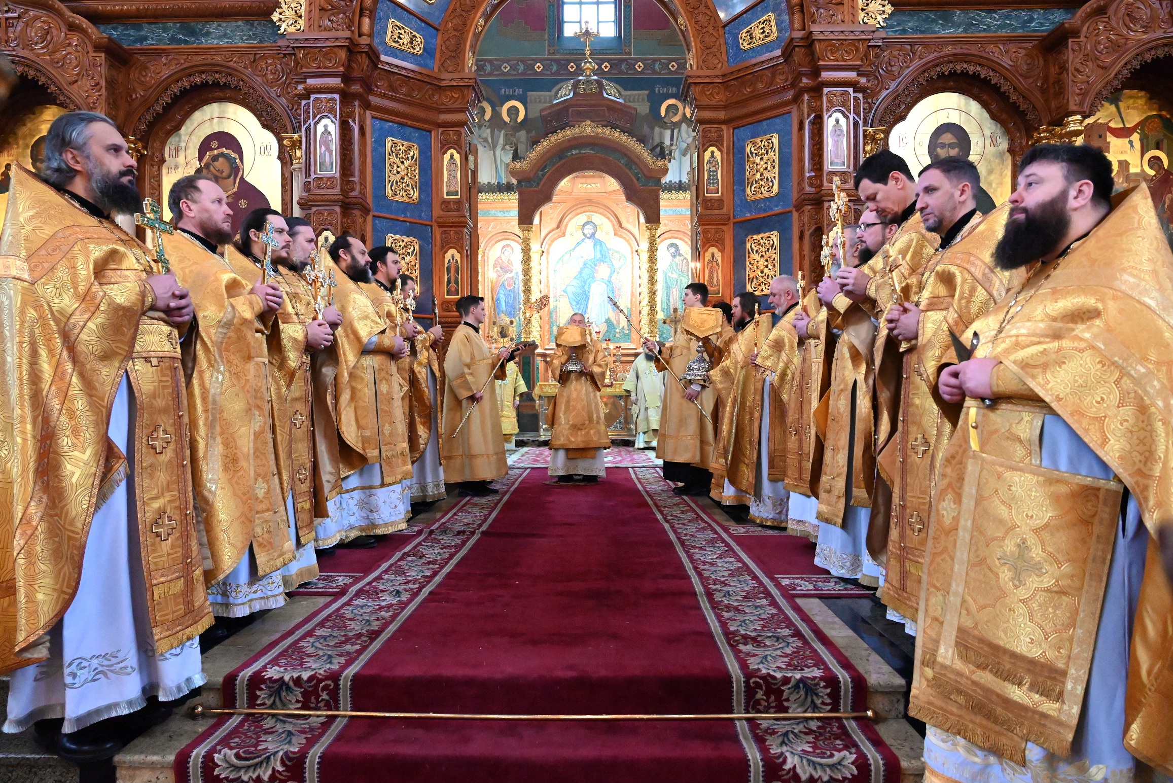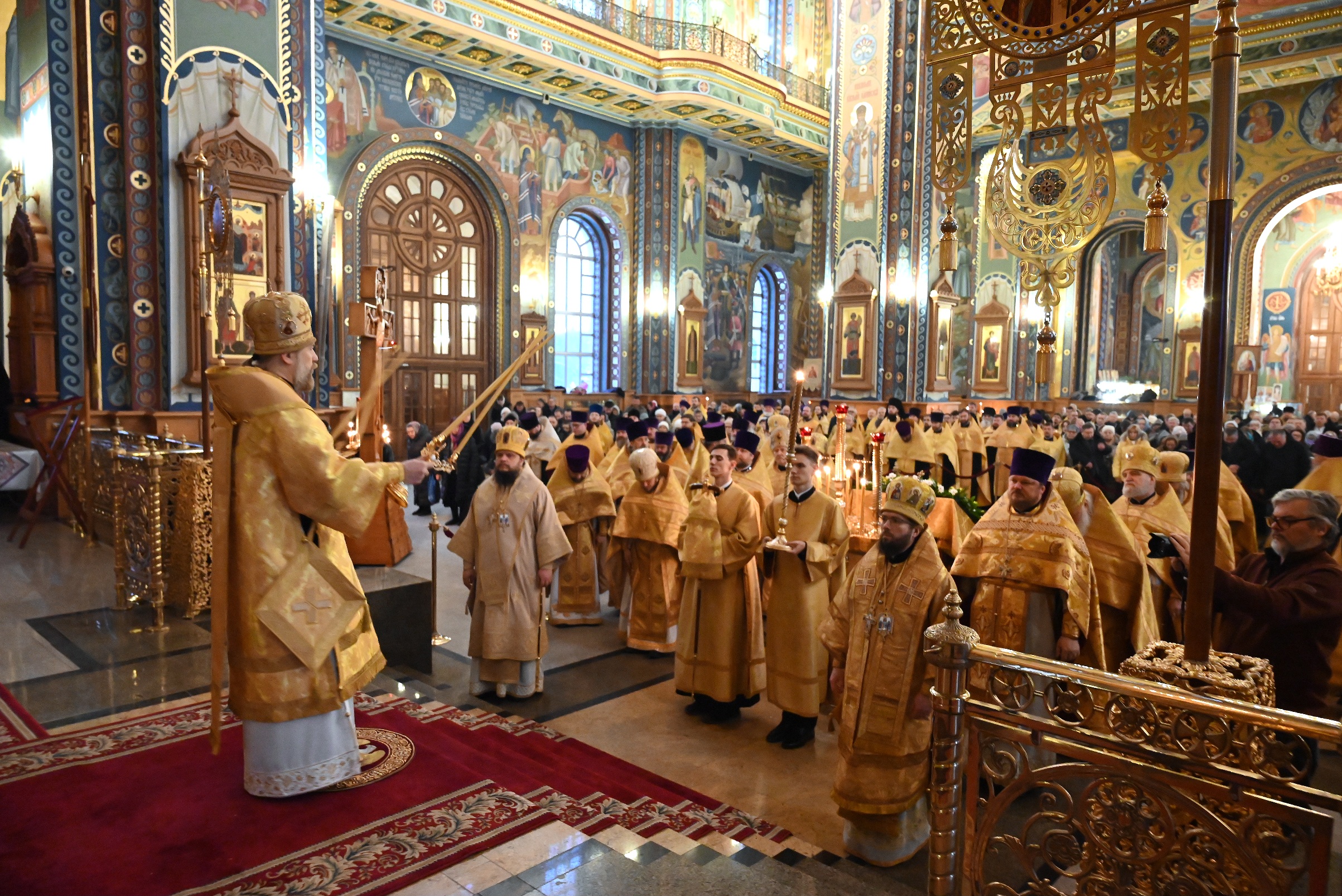 На сугубой ектении были произнесены прошения: "...о еже прияти молитвы нас недостойных рабов Твоих в сию годину испытания..." и прошение о "Преосвященных архипастырях, пастырях, монашествующих и мирянах земли Украинския, о единстве Церкви Христовы ревнующих, в заточении и гонениях сущих". Затем митрополит Леонтий вознес молитву о Святой Руси. По благословению Святейшего Патриарха Московского и всея Руси Кирилла эта молитва читается за Литургией во всех храмах Русской Православной Церкви.