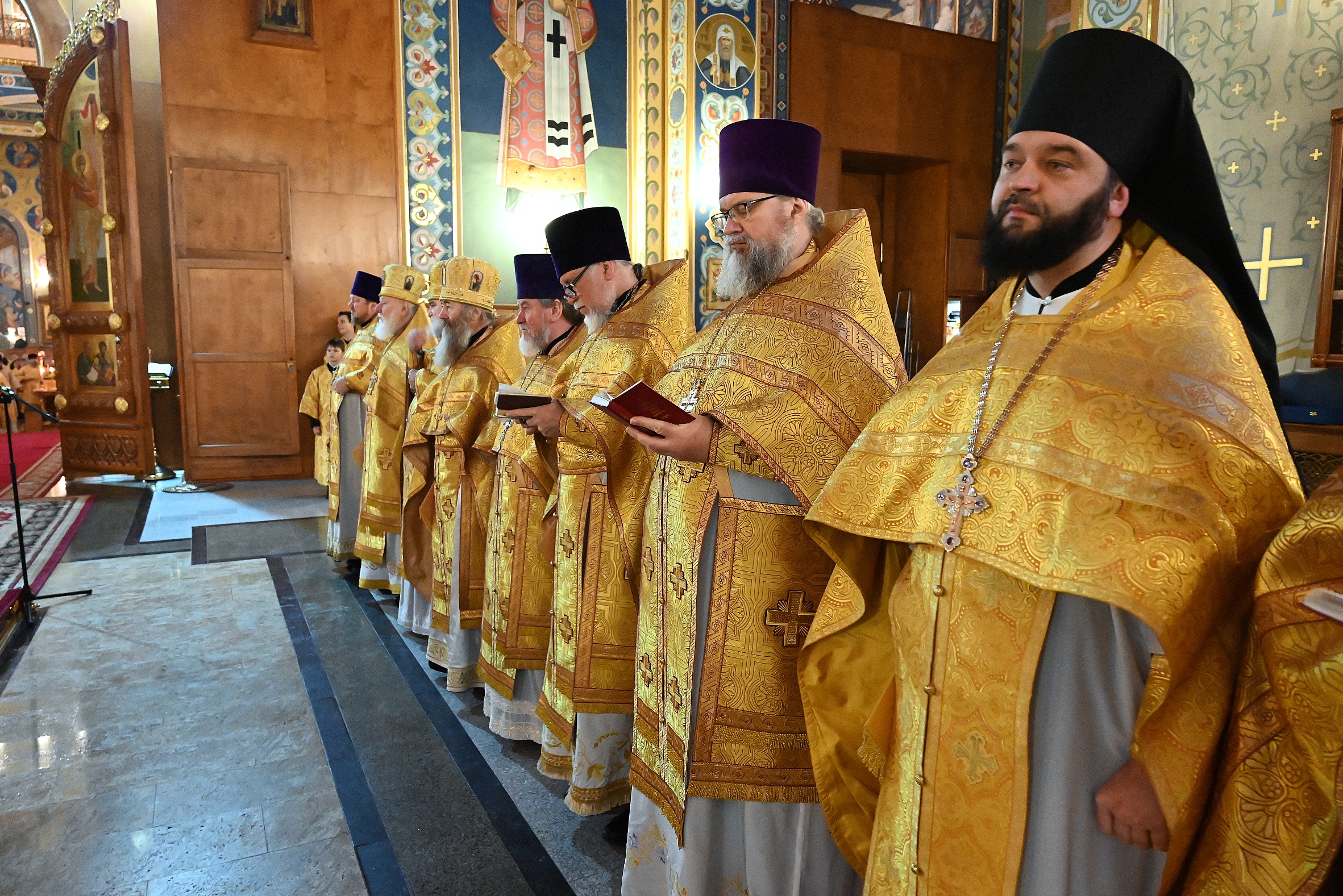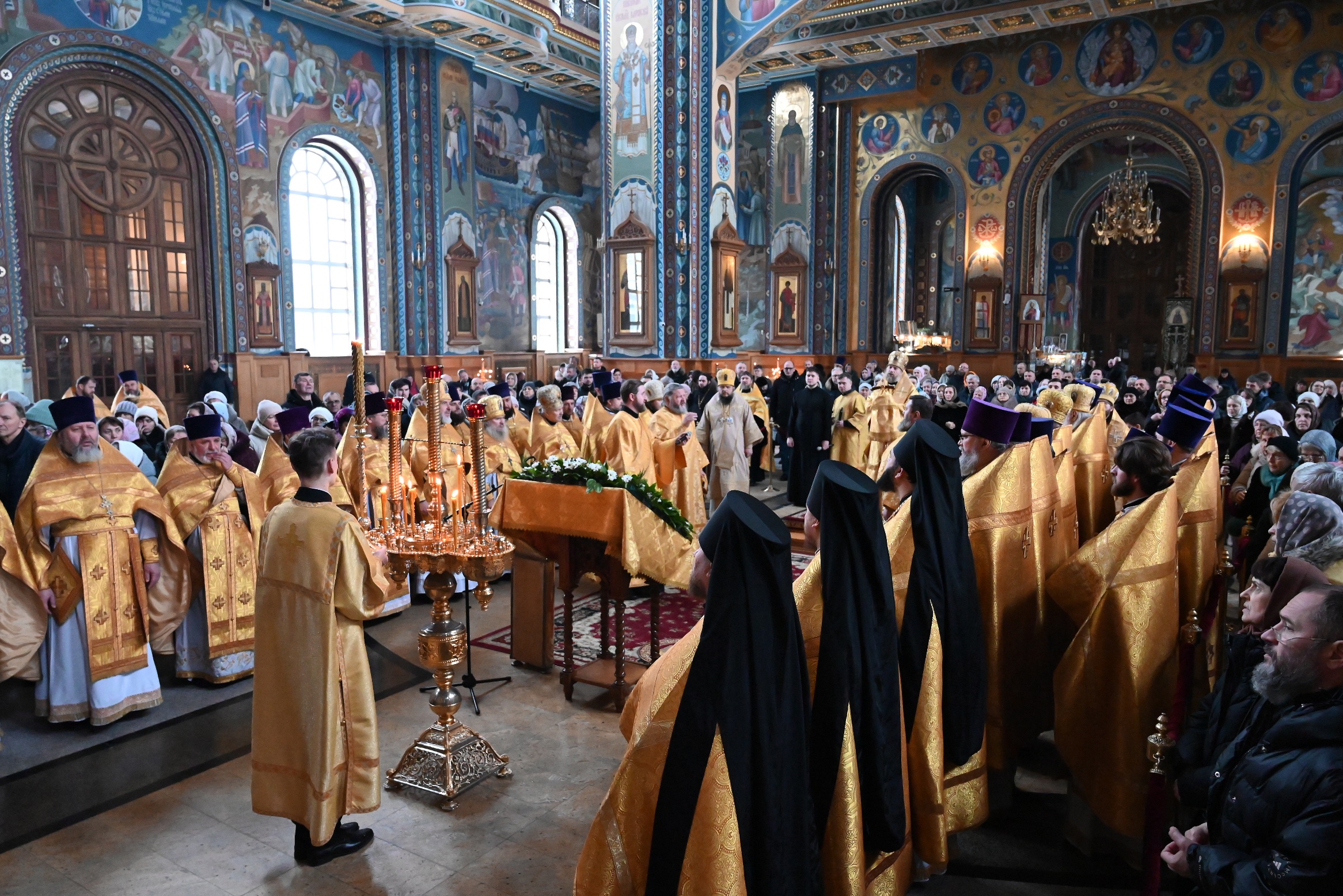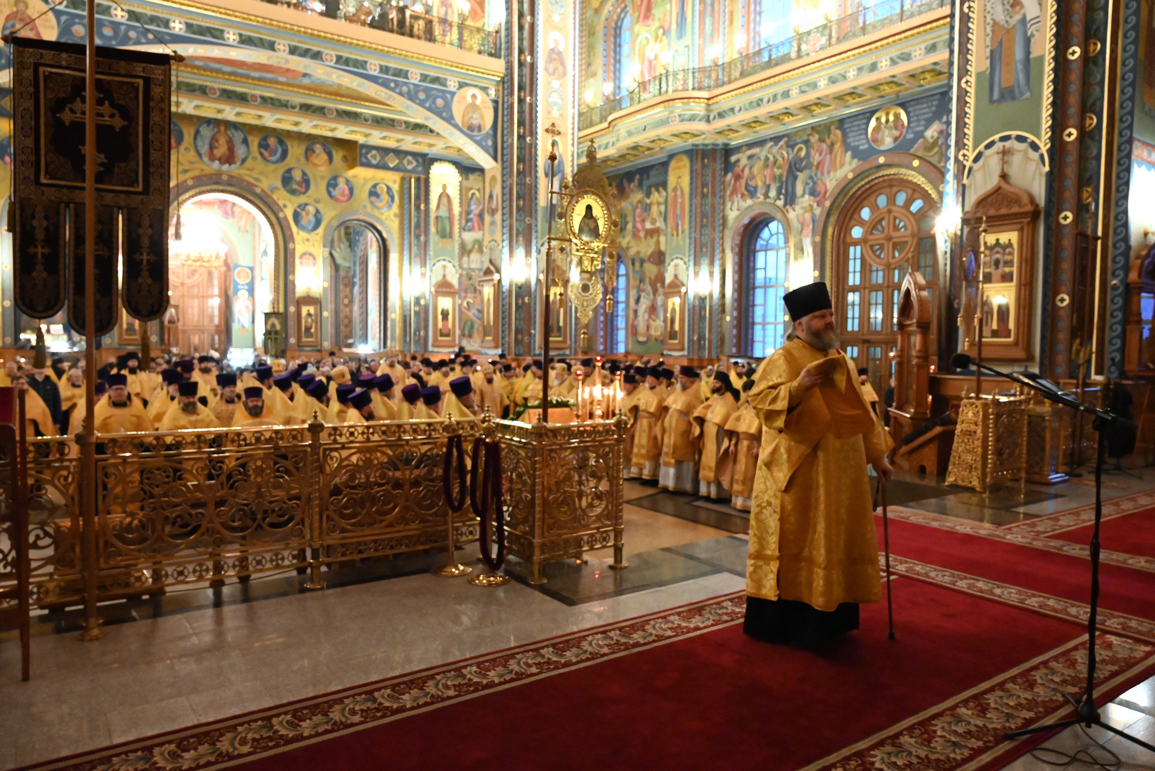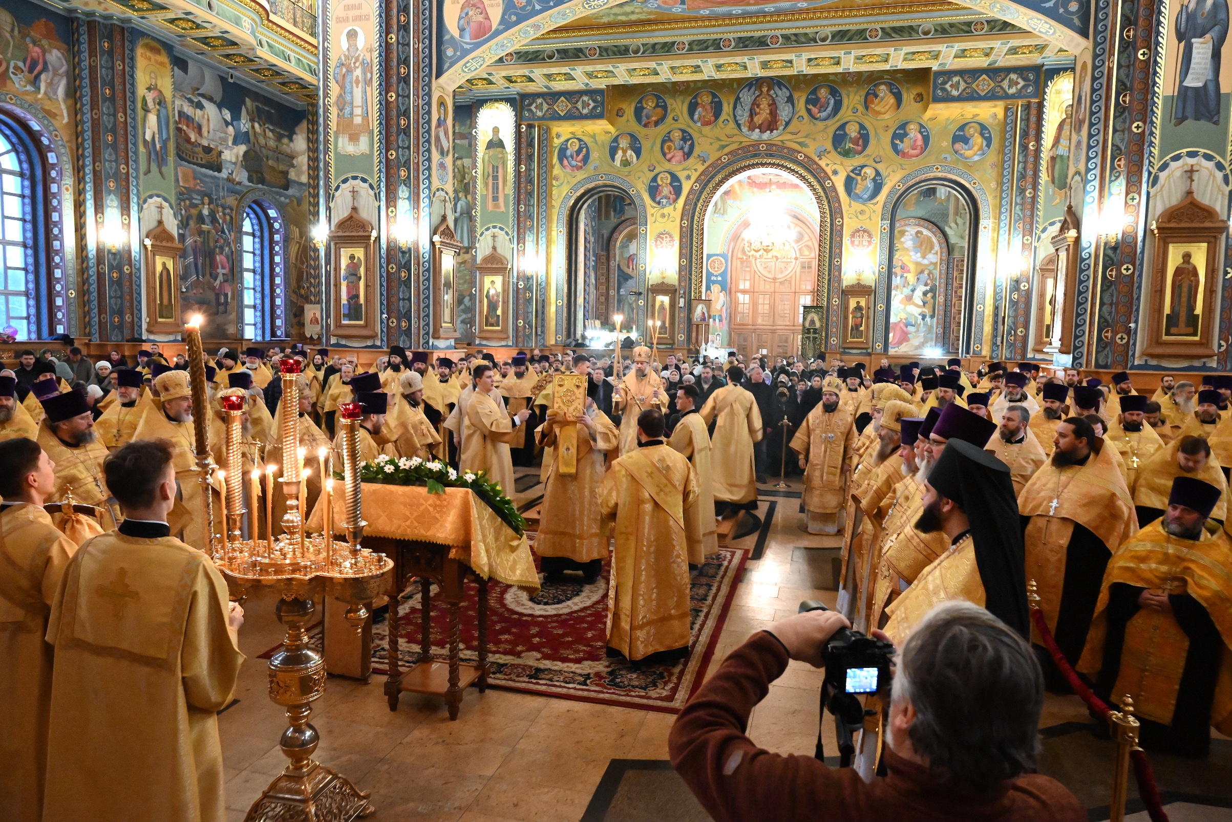 На сугубой ектении были произнесены прошения: "...о еже прияти молитвы нас недостойных рабов Твоих в сию годину испытания..." и прошение о "Преосвященных архипастырях, пастырях, монашествующих и мирянах земли Украинския, о единстве Церкви Христовы ревнующих, в заточении и гонениях сущих". Затем митрополит Леонтий вознес молитву о Святой Руси. По благословению Святейшего Патриарха Московского и всея Руси Кирилла эта молитва читается за Литургией во всех храмах Русской Православной Церкви.
