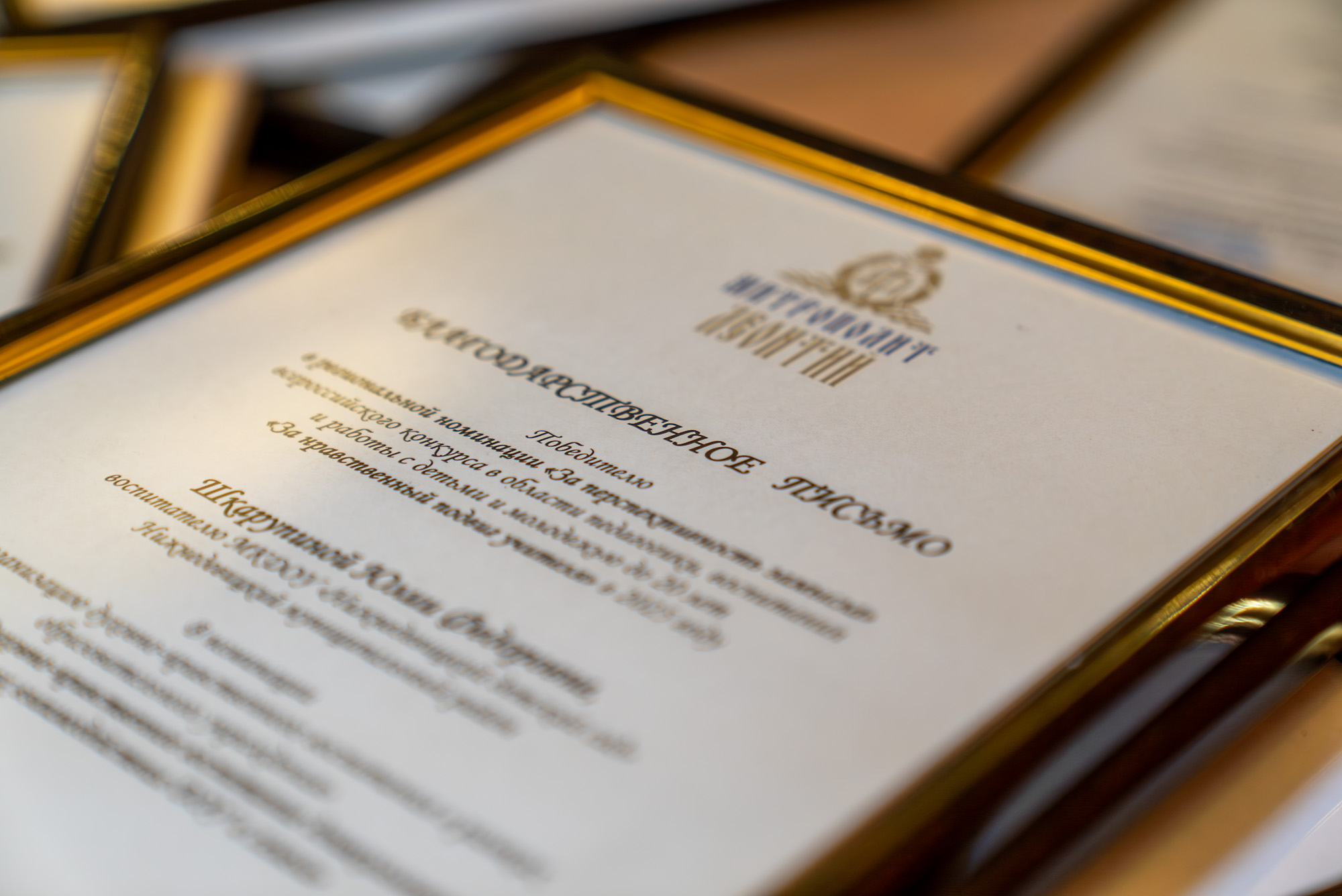 Затем состоялось награждение Благодарственными письмами и памятными подарками от митрополита Воронежского и Лискинского Леонтия и Грамотами министерства Воронежской области педагогов победителей регионального этапа Всероссийского конкурса в области педагогики, воспитания и работы с детьми и молодежью до 20 лет «За нравственный подвиг учителя» и регионального этапа межрегионального конкурса лучших образовательных проектов в системе духовно-нравственного воспитания «Вифлеемская звезда».