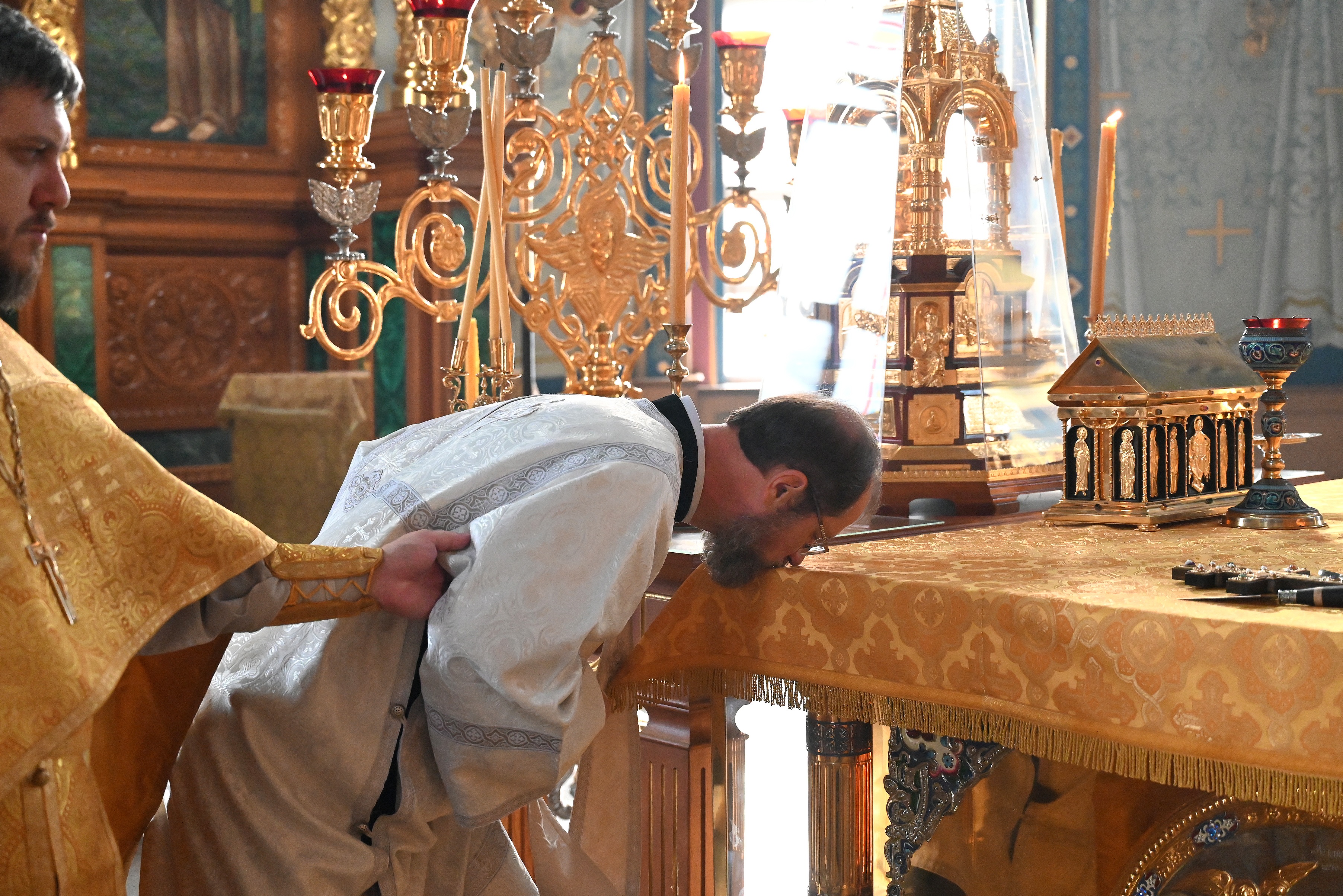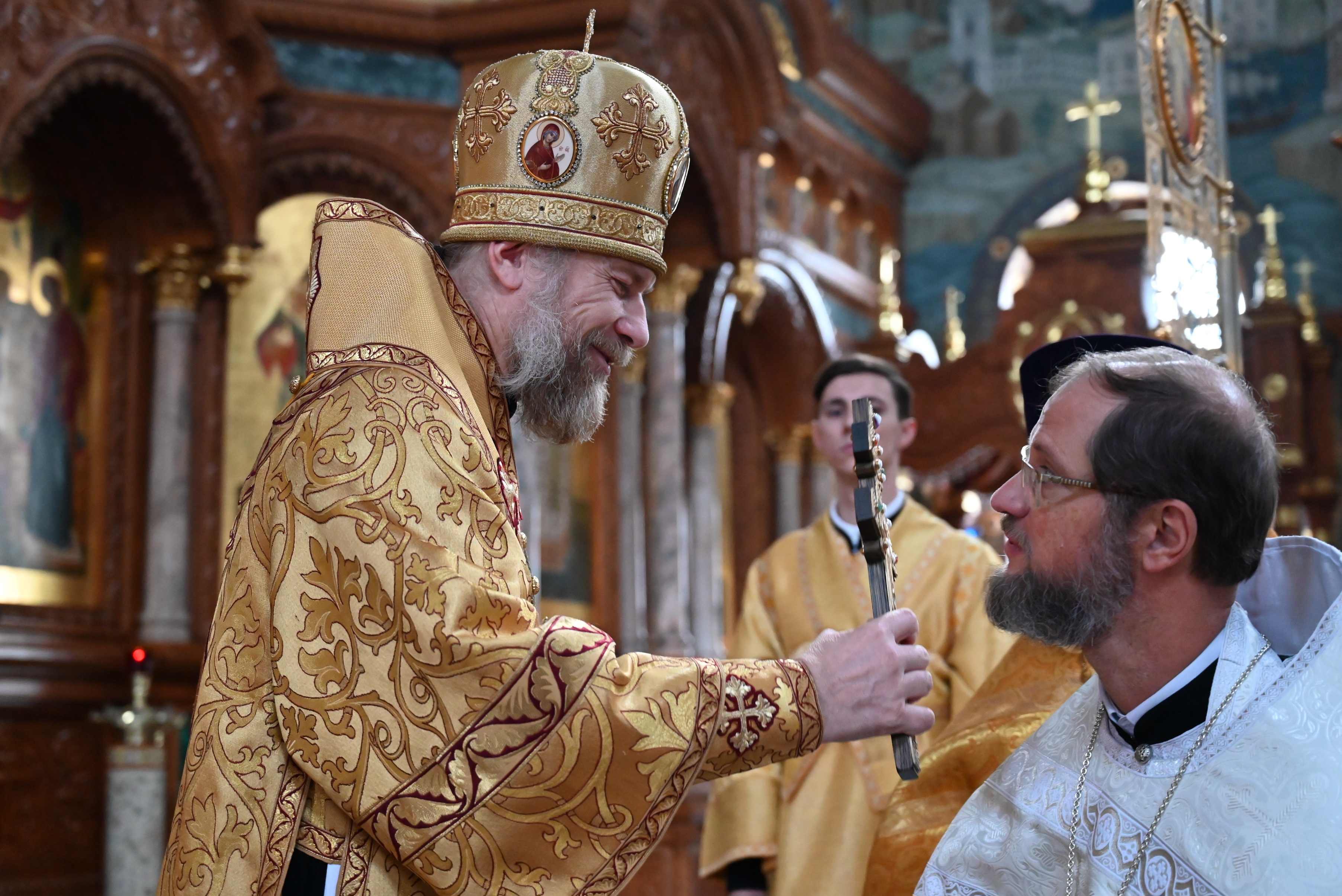 На сугубой ектении были произнесены особые прошения: "...о еже прияти молитвы нас недостойных рабов Твоих в сию годину испытания..." и прошение о "Преосвященных архипастырях, пастырях, монашествующих и мирянах земли Украинския, о единстве Церкви Христовы ревнующих, в заточении и гонениях сущих". Затем митрополит Леонтий вознес молитву о Святой Руси. По благословению Святейшего Патриарха Московского и всея Руси Кирилла эта молитва читается во всех храмах Русской Православной Церкви.