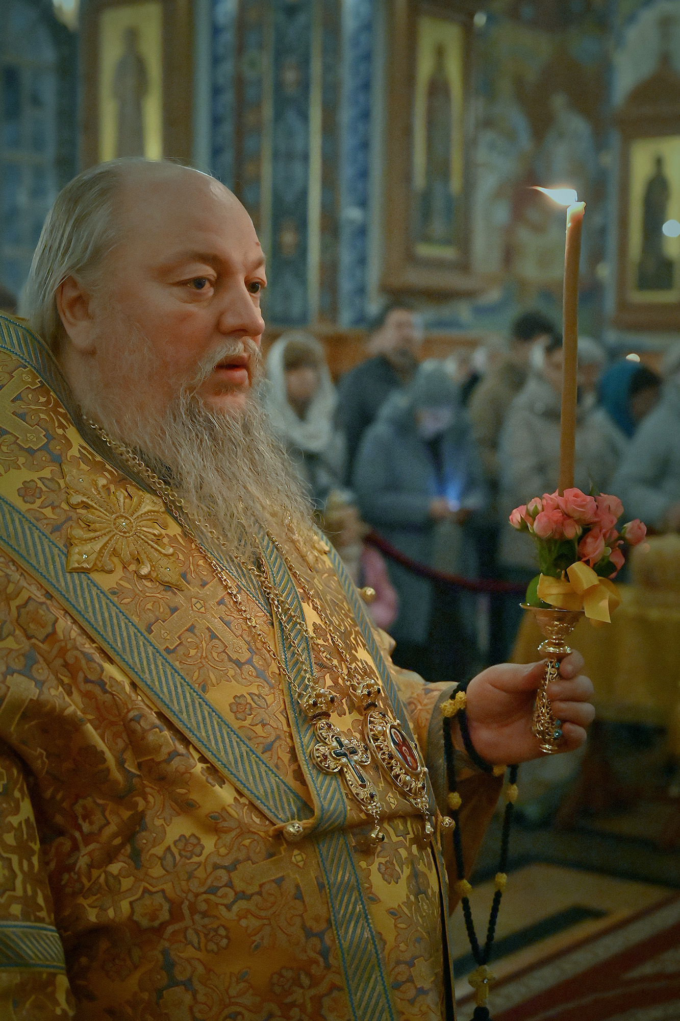 На полиелее митрополит Леонтий совершил полное каждение храма. В это время священнослужители и хор попеременно воспевали: "Величаем тя, святителю отче наш Митрофане, и чтим святую память твою, ты бо молиши о нас Христа Бога нашего". После антифона и прокимна митрополит Леонтий возгласил евангельское зачало о Добром Пастыре, читаемое в дни памяти святителей.