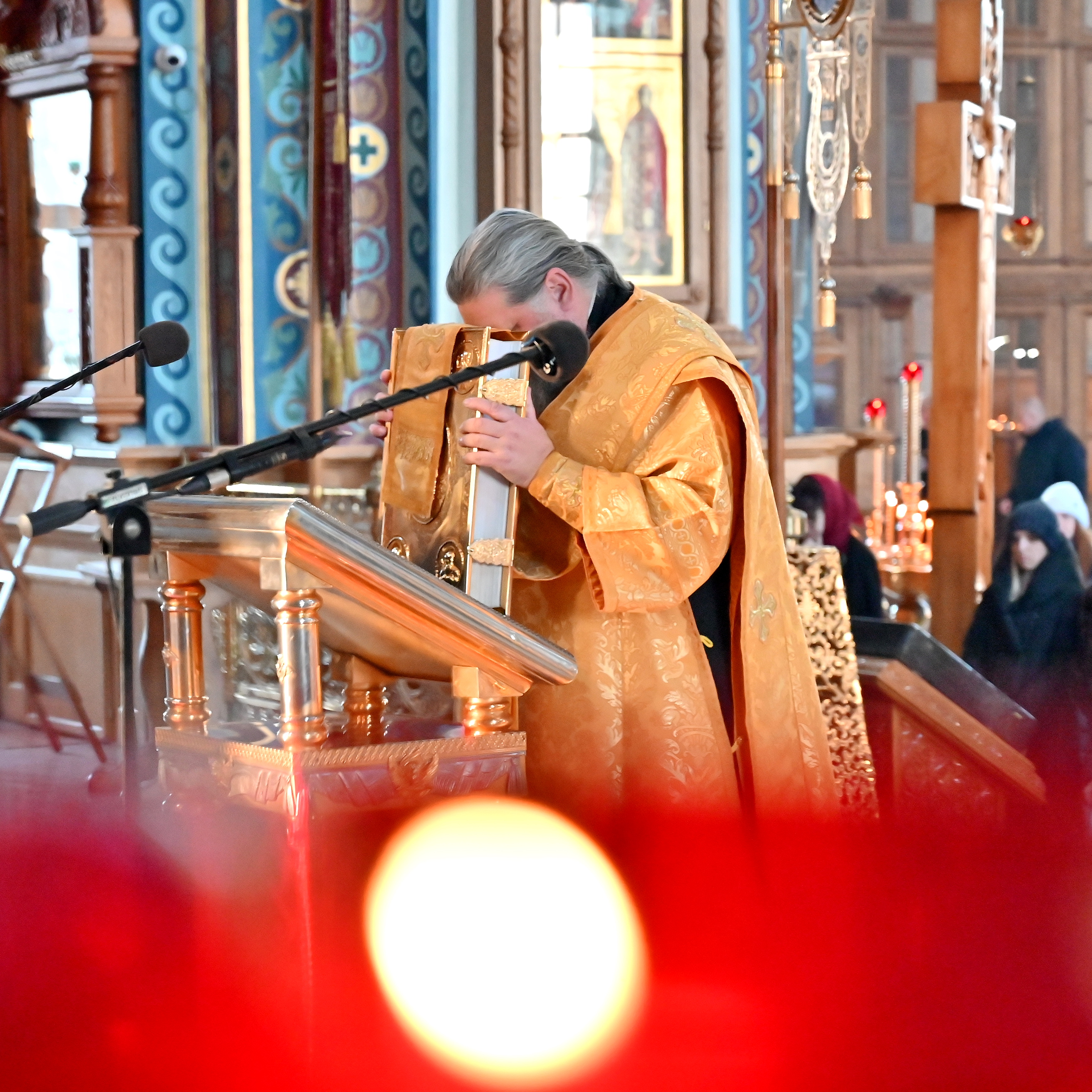 На сугубой ектении, помимо прошений о "...о еже прияти молитвы нас недостойных рабов Твоих в сию годину испытания..." и прошение о "Преосвященных архипастырях, пастырях, монашествующих и мирянах земли Украинския, о единстве Церкви Христовы ревнующих, в заточении и гонениях сущих" были произнесены благодарственные прошения в которых молитвенно поминался святейшей патриарх Московский и всея Руси Кирилл.