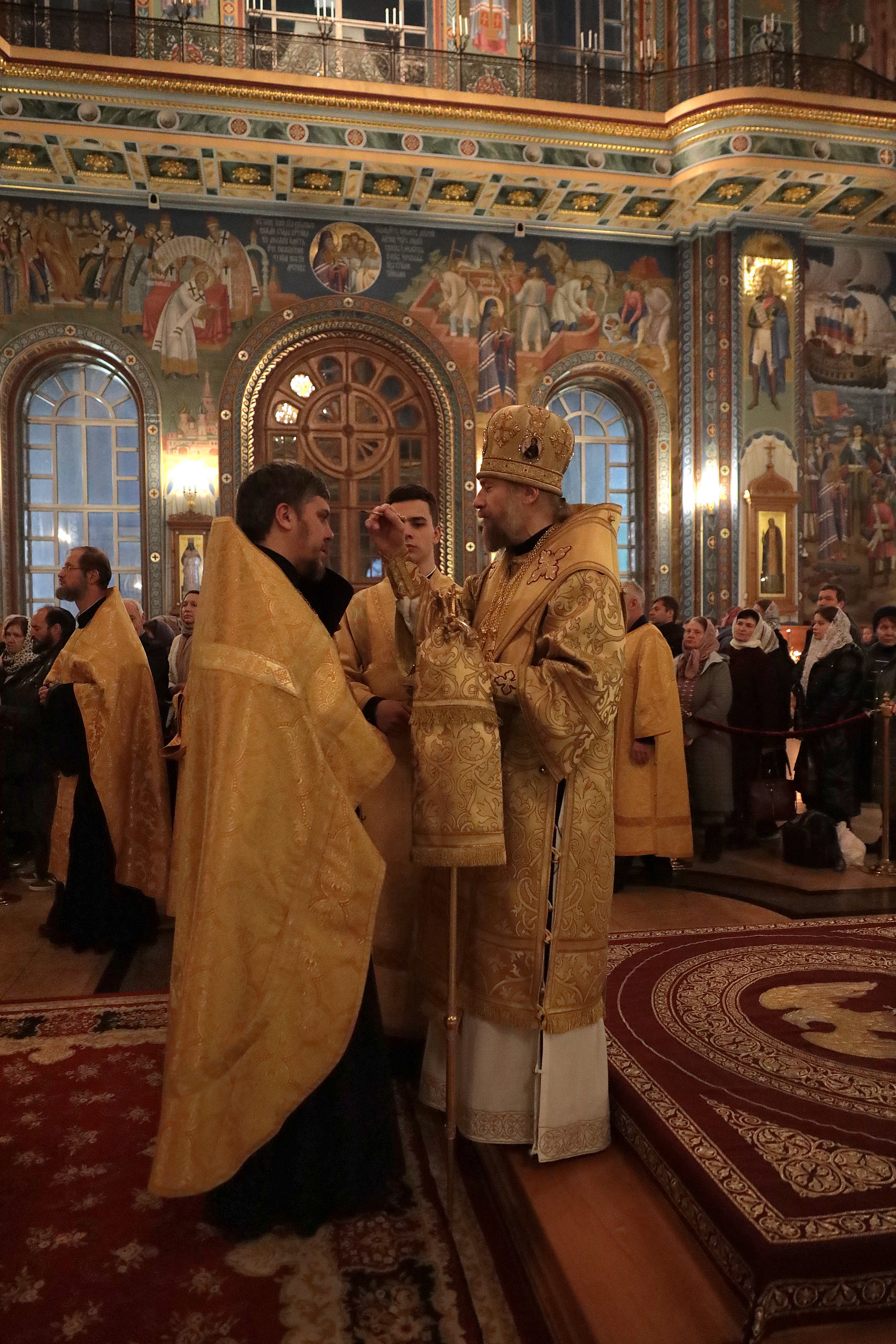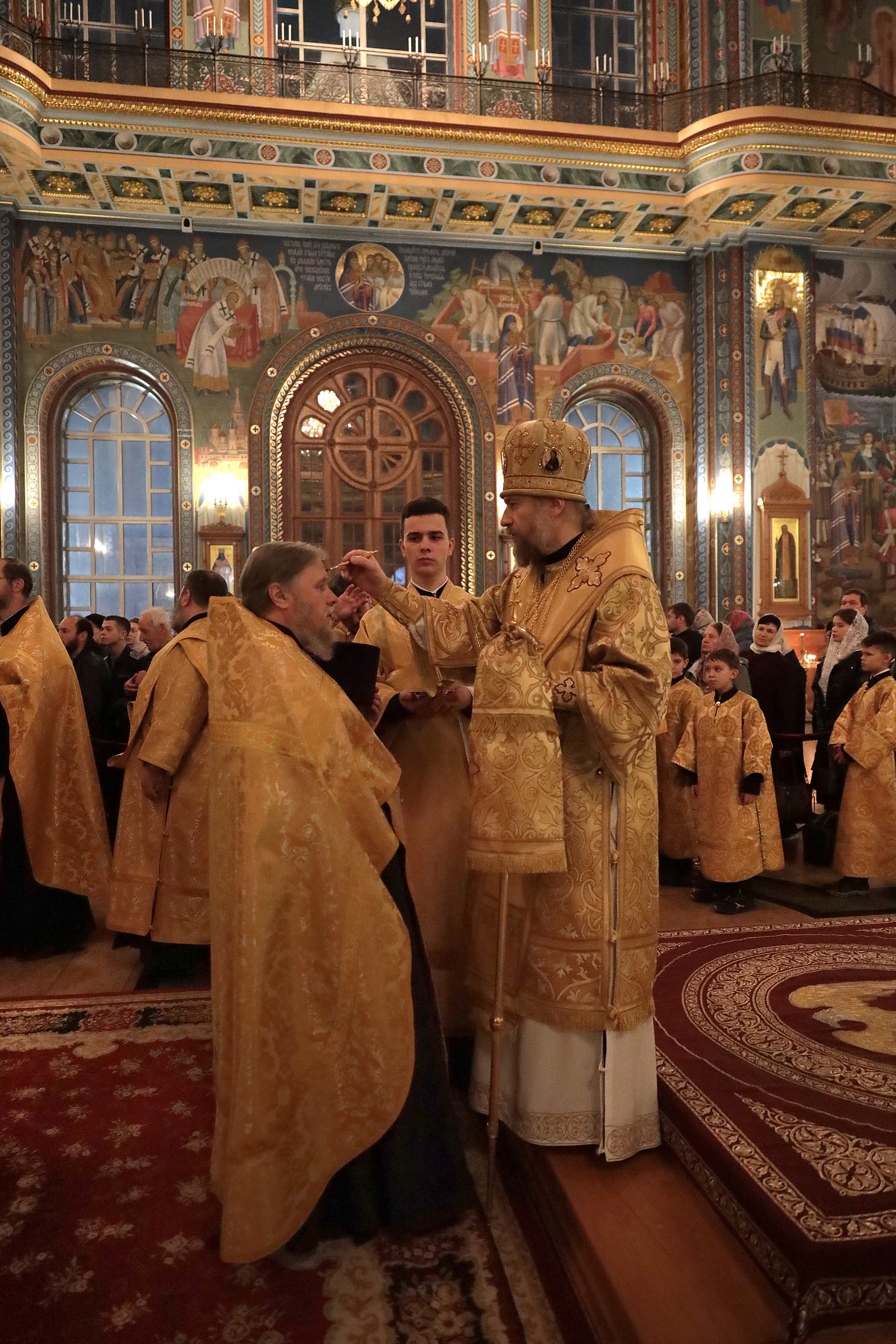 Во время чтения канонов на утрени владыка Леонтий помазал духовенство и богомольцев освященным елеем.
