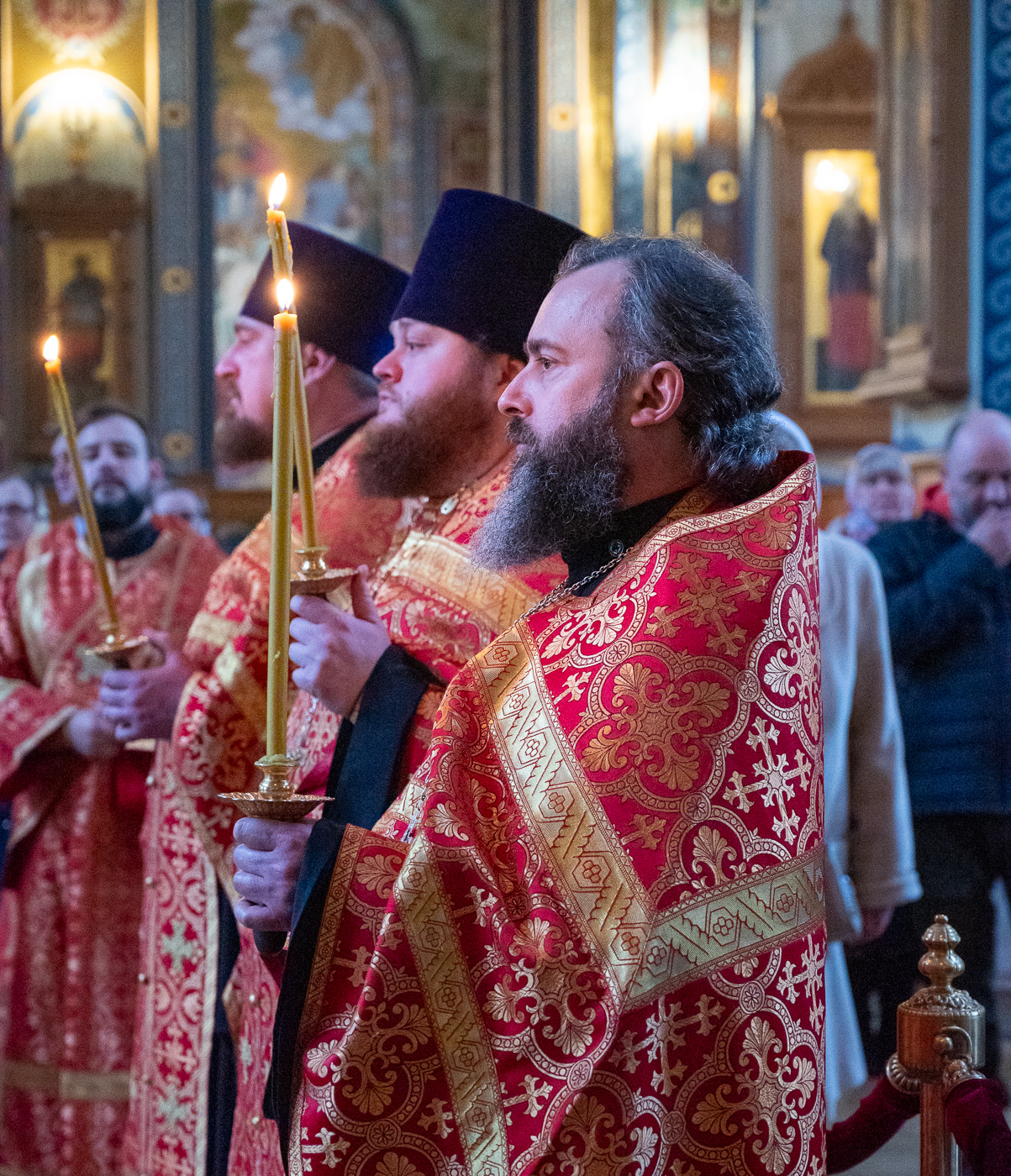 При совершении полиелея, во время пения хором тропарей воскресных по Непорочных "Ангельский собор удивися" Архипастырь совершил полное каждение храма.