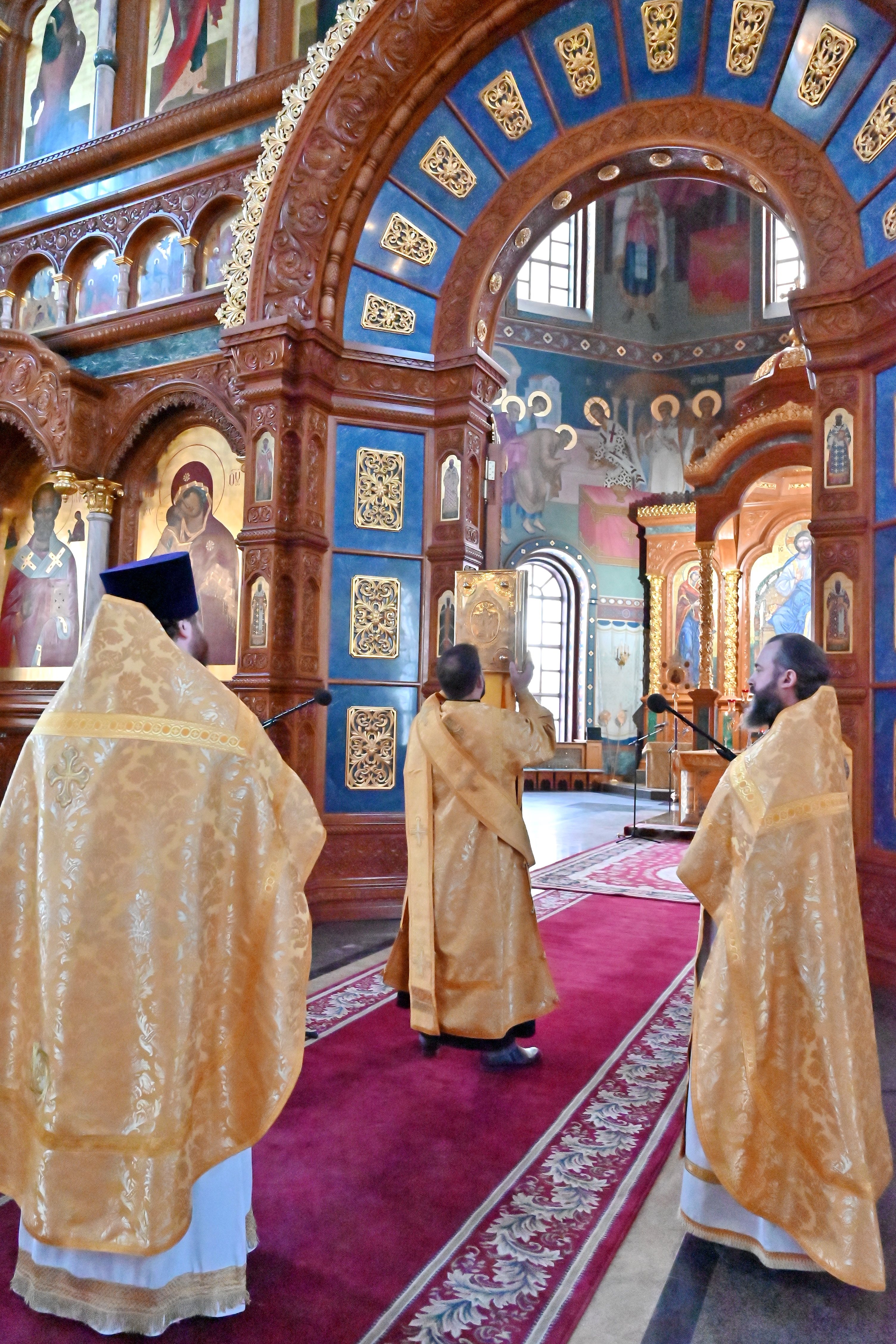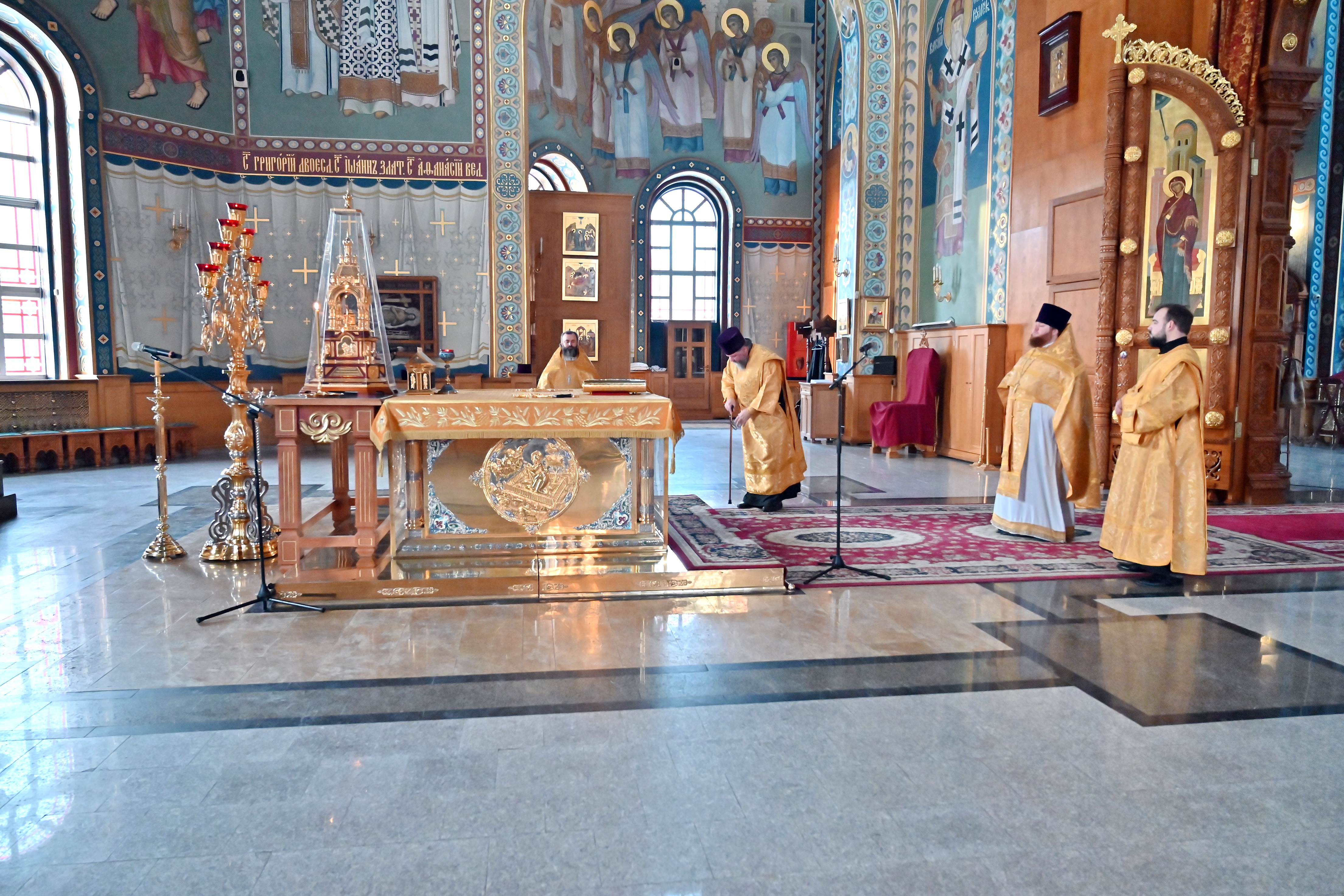 По окончании Литургии духовенство собора совершило славление святителям — Василию Великому, Григорию Богослову и Иоанну Златоусту — перед иконой праздника.