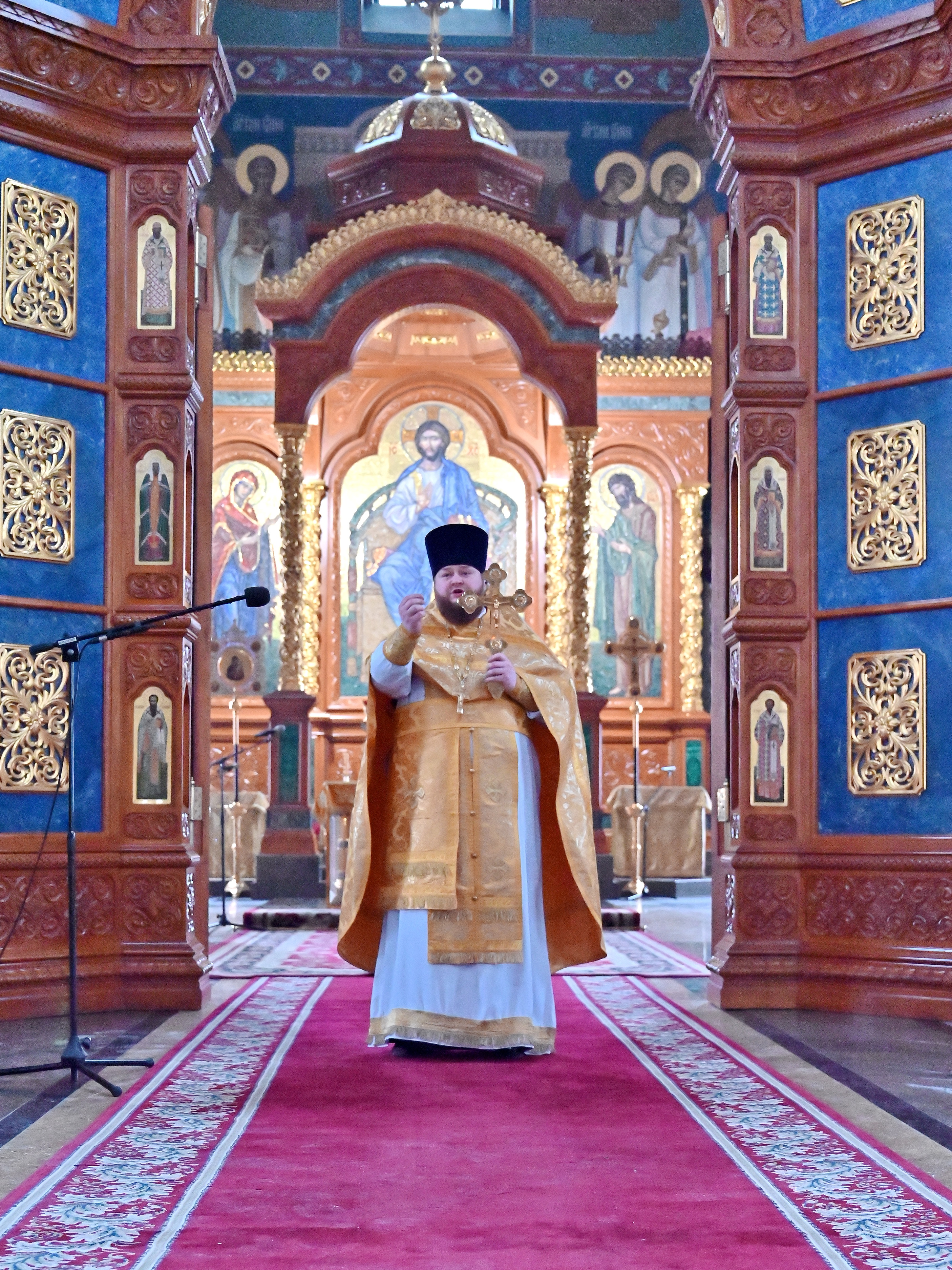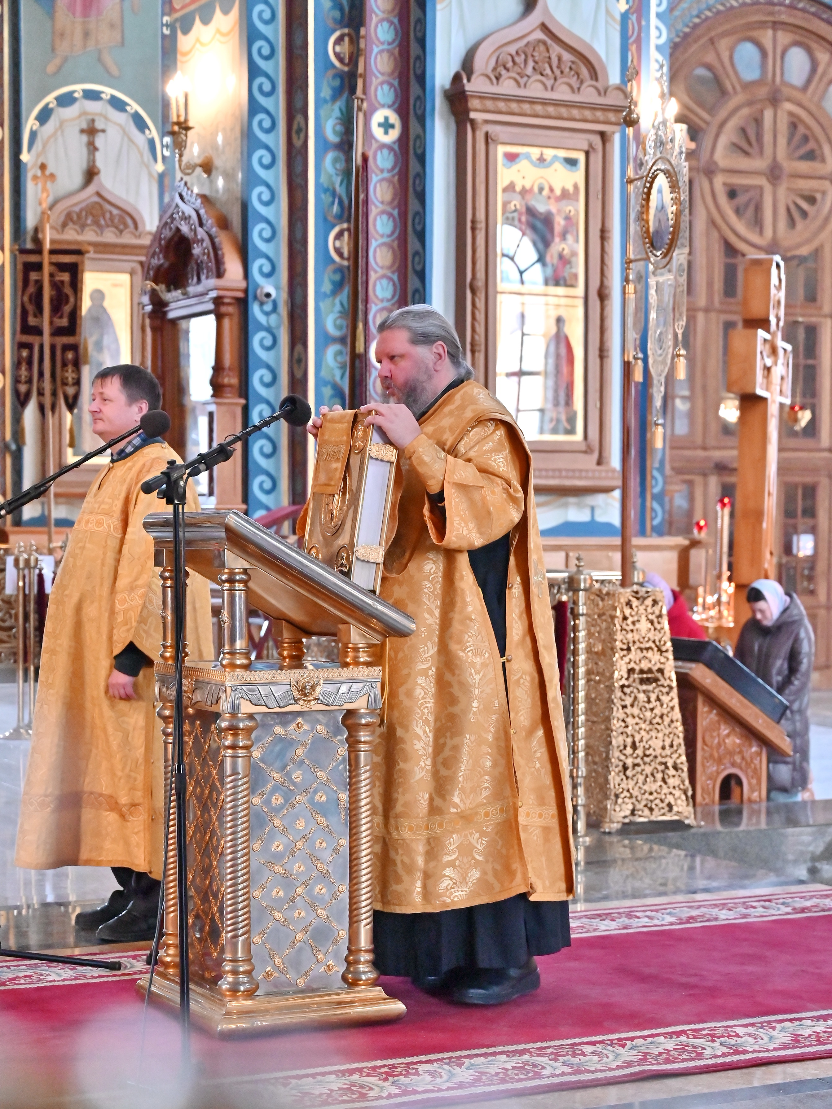 За литургией были прочитаны Апостольское и Евангельское чтения. На сугубой ектении иерей Олег вознес молитву о Святой Руси.