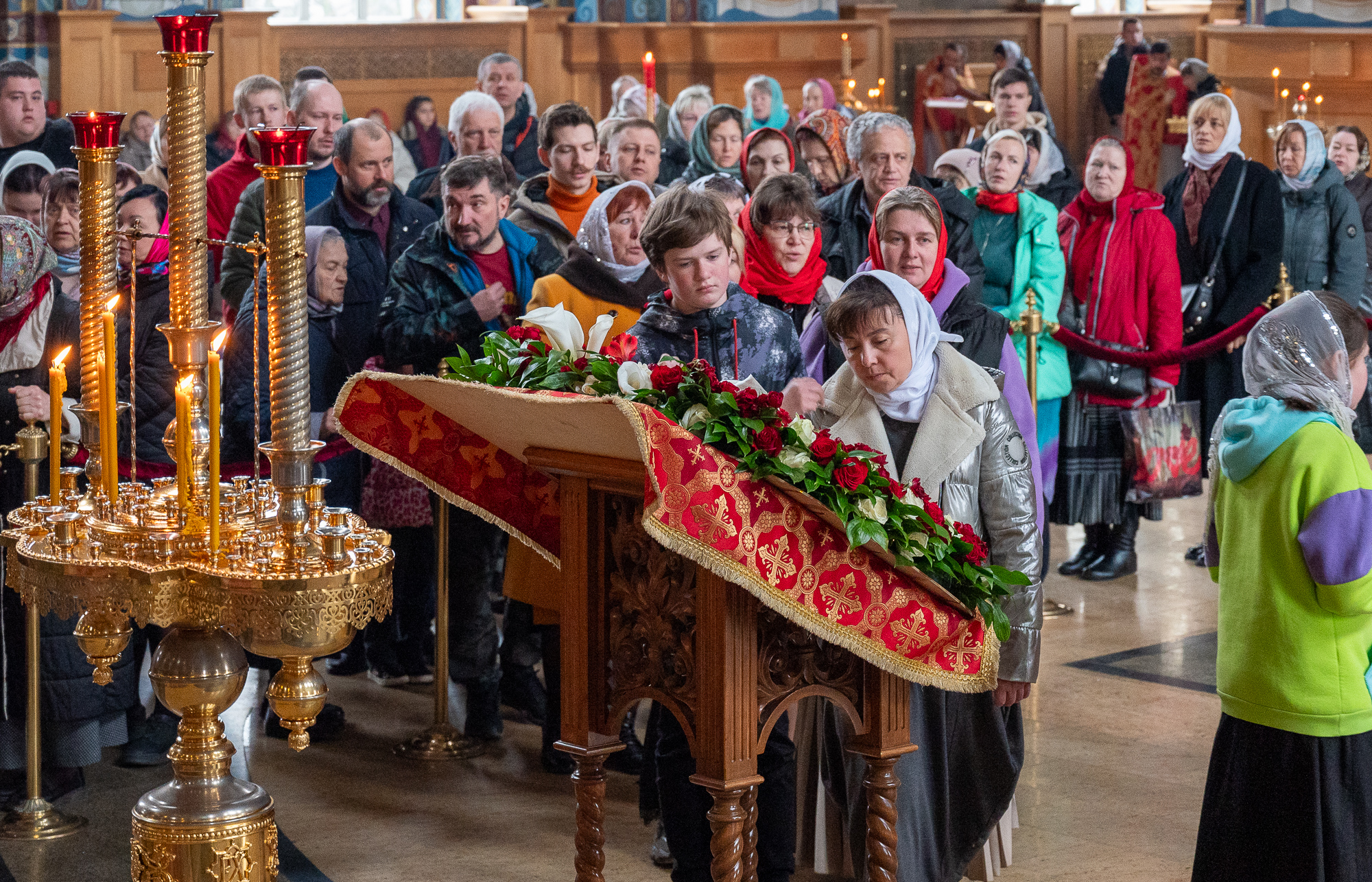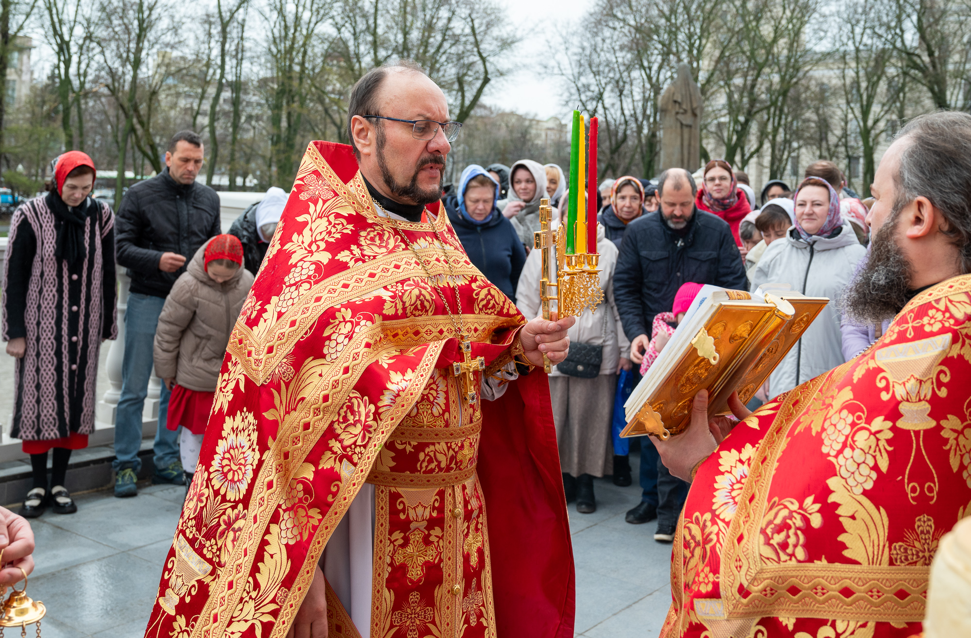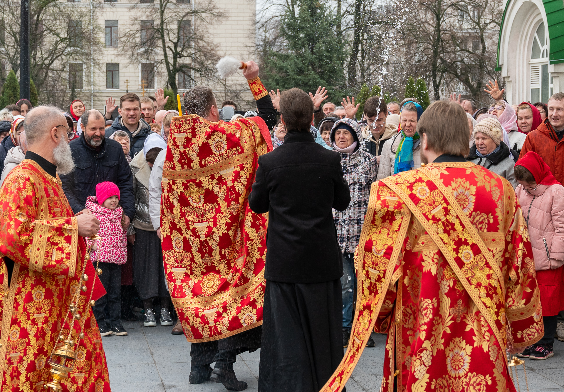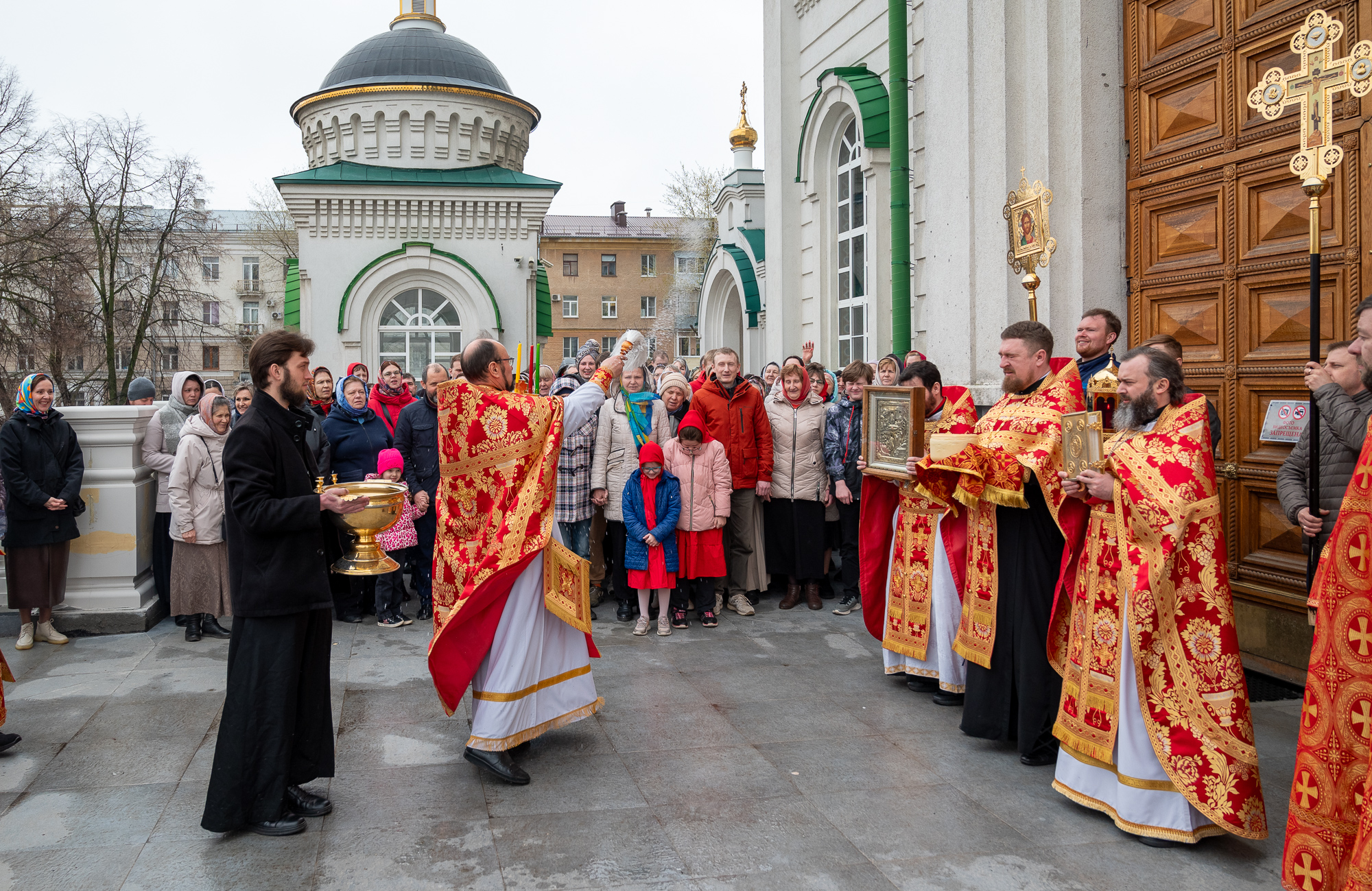 По заамвонной молитве, духовенство, вместе с народом, совершили Крестный ход вокруг храма. Крестное шествие совершило четыре остановки, во время которых молящиеся осенялись крестом и окроплялись Святой водой.