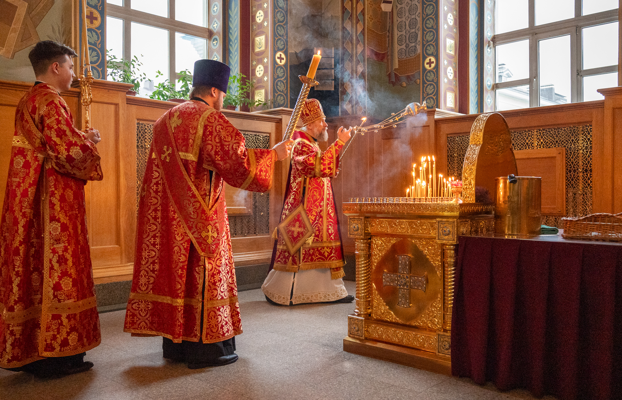 При совершении полиелея многократно воспевалось величание праздника: "Величаем Тя, Живодавче Христе, нас ради во ад сшедшаго и с Собою вся воскресившаго". Во время пения величания Архипастырь совершил полное каждение храма.