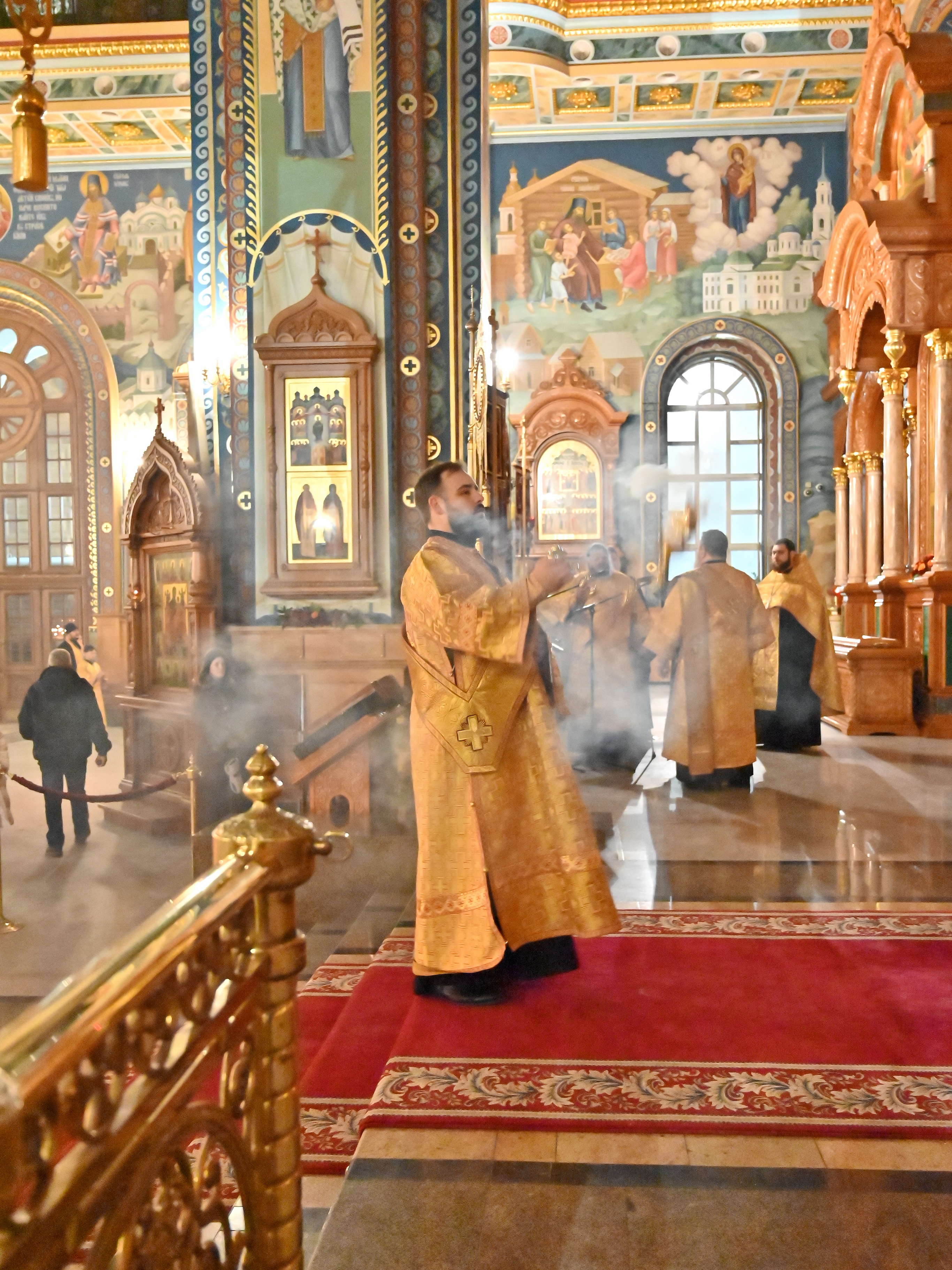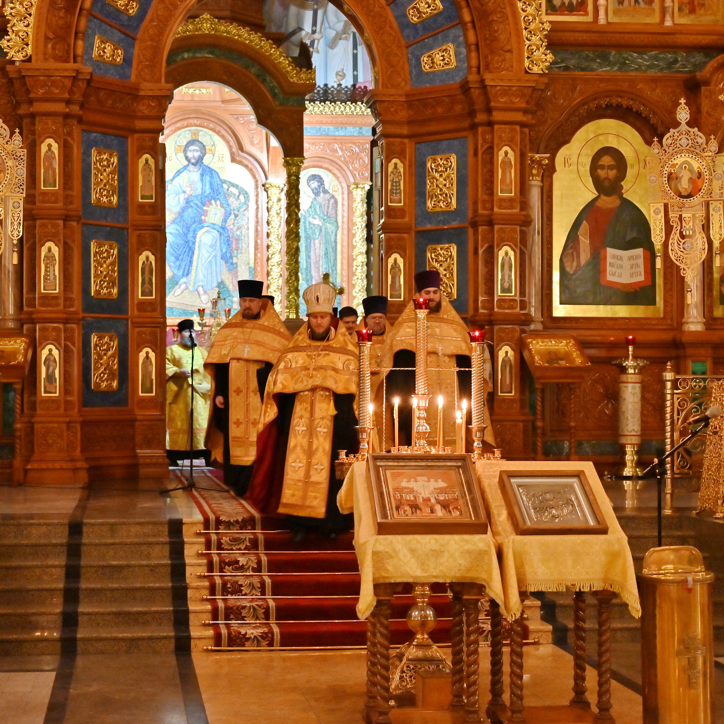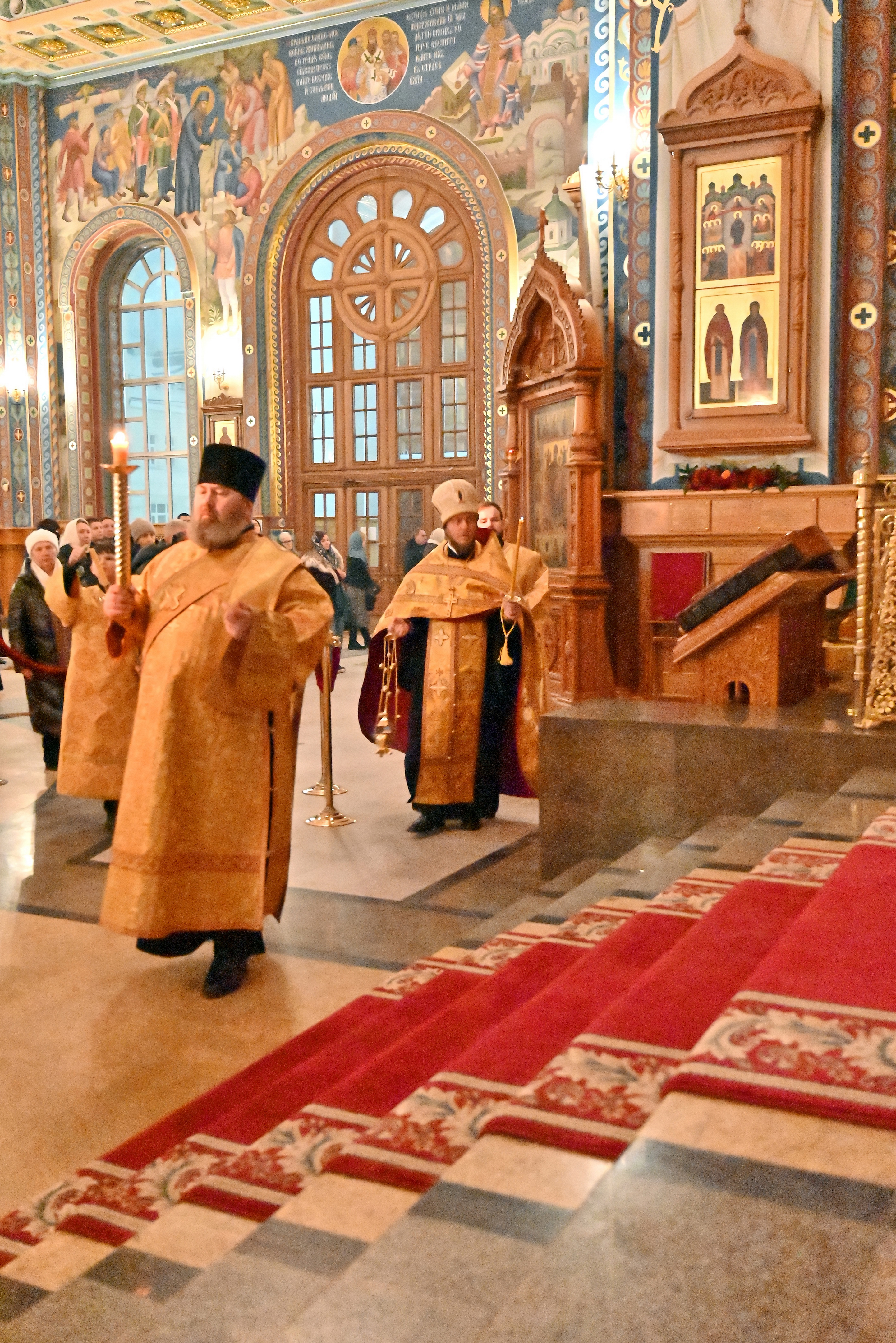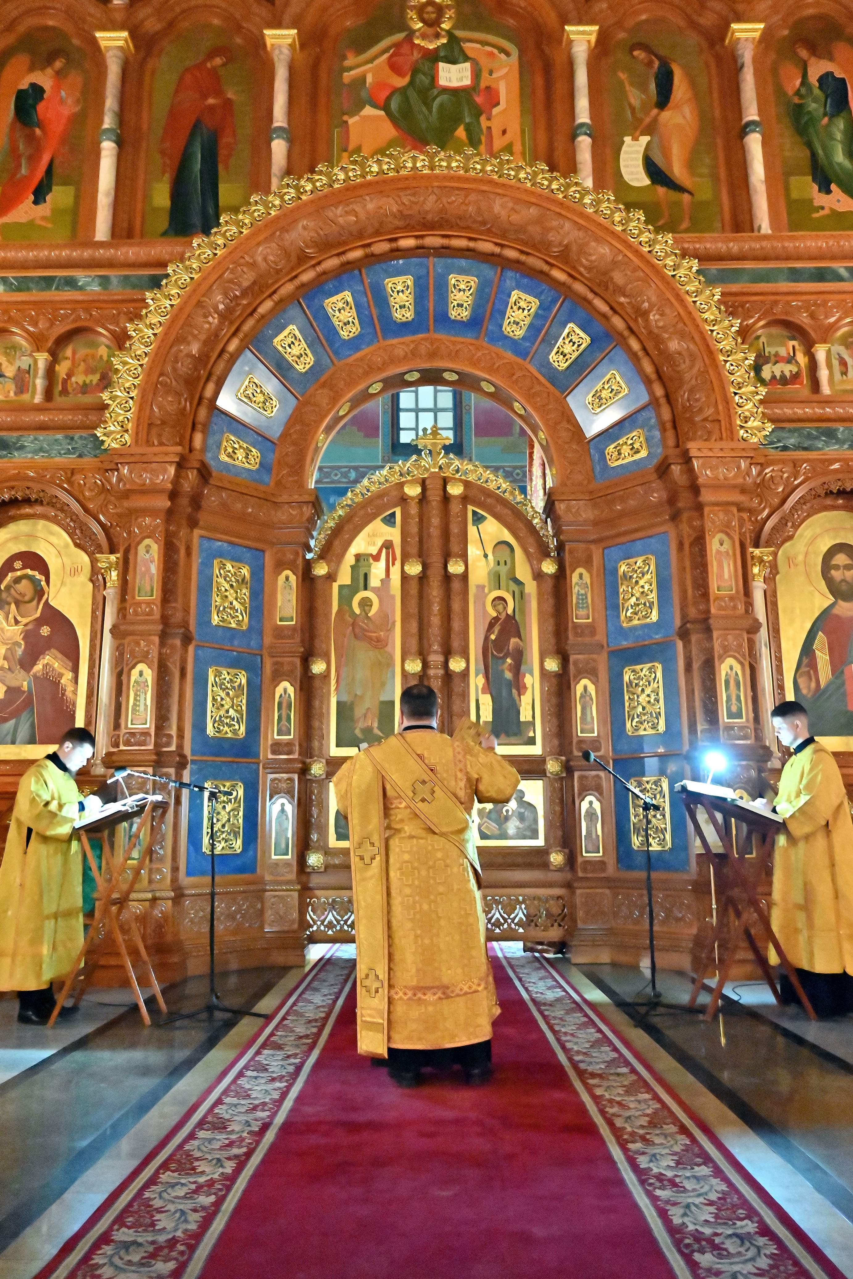 Богослужение возглавил архимандрит Серафим (Тищенко) . Его Высокопреподобию сослужили клирики собора.