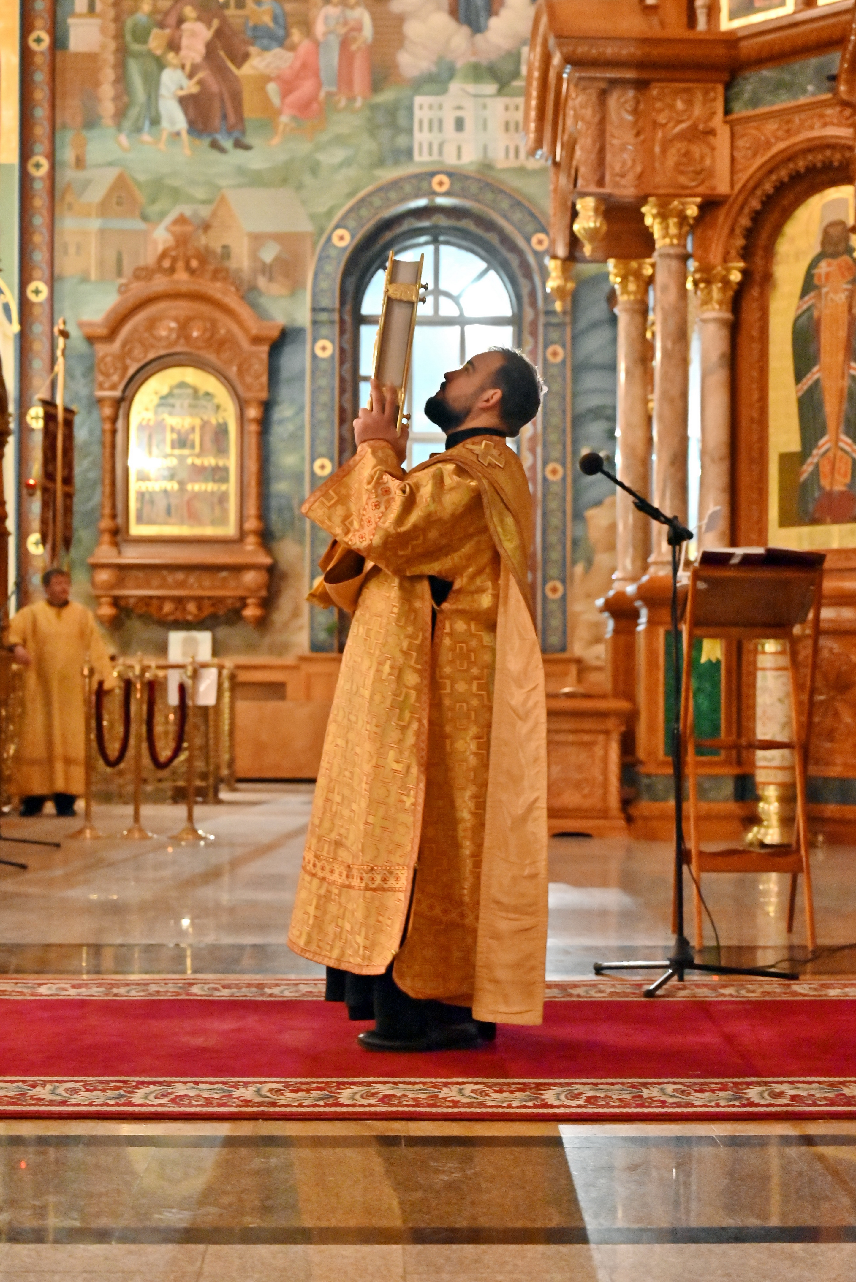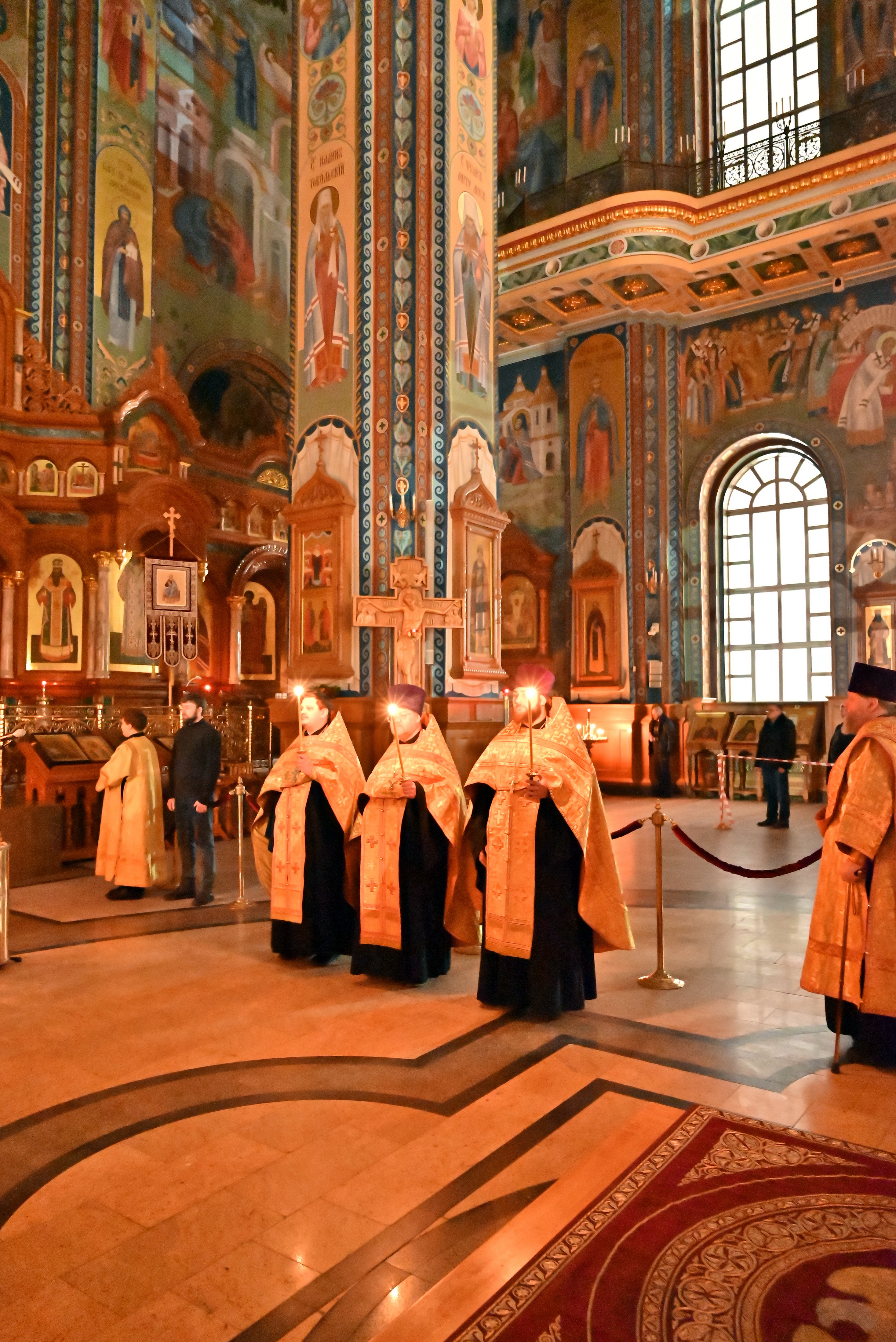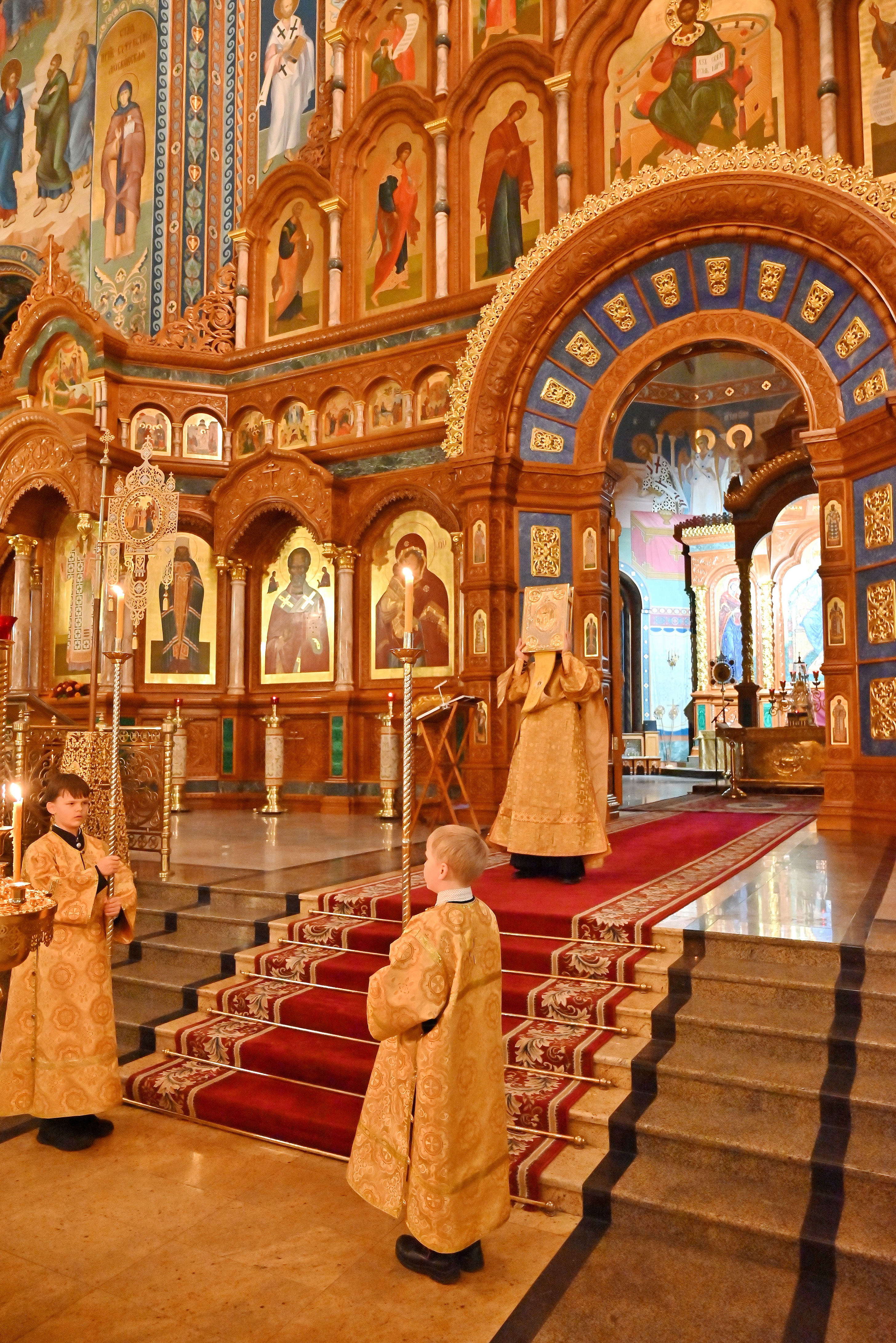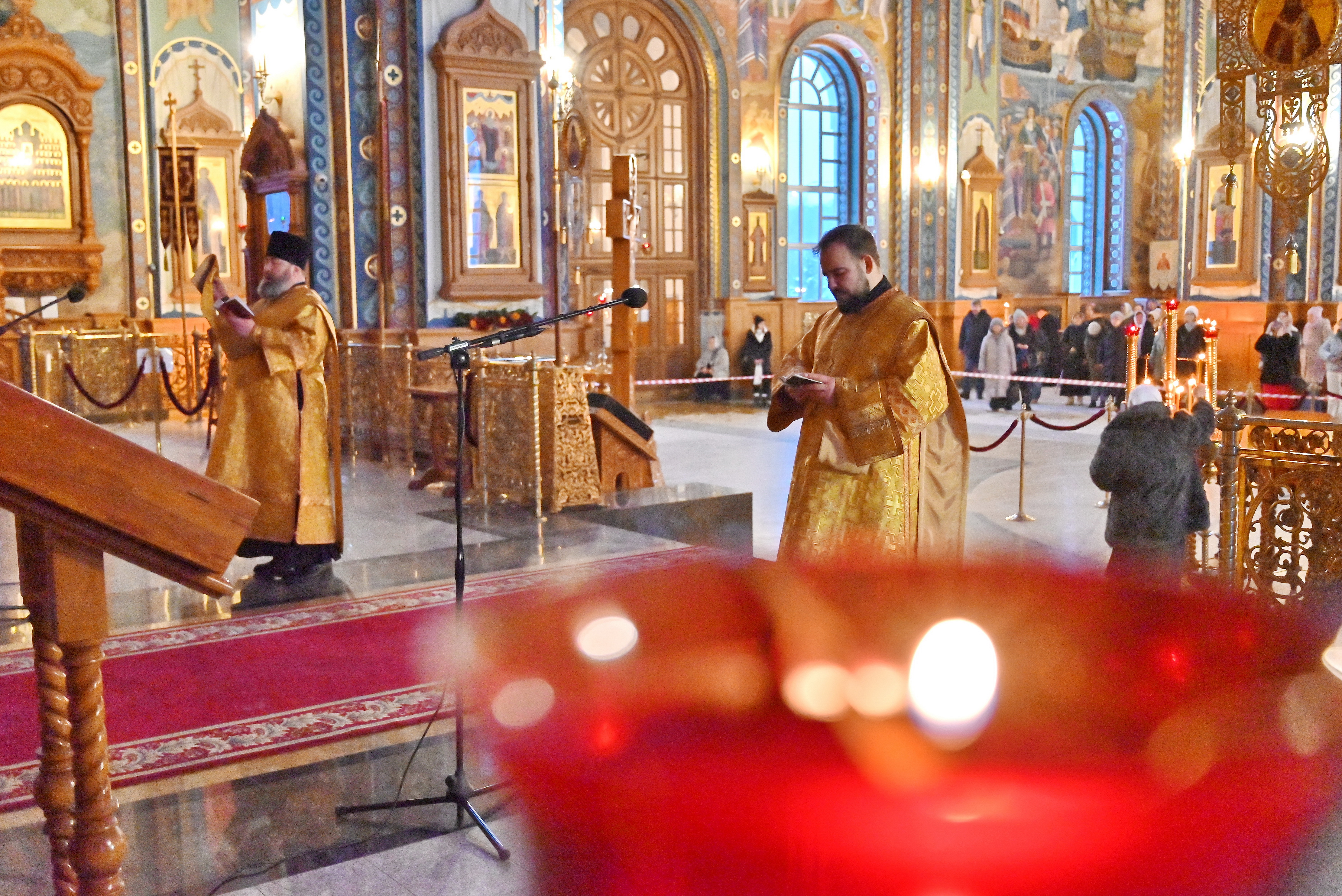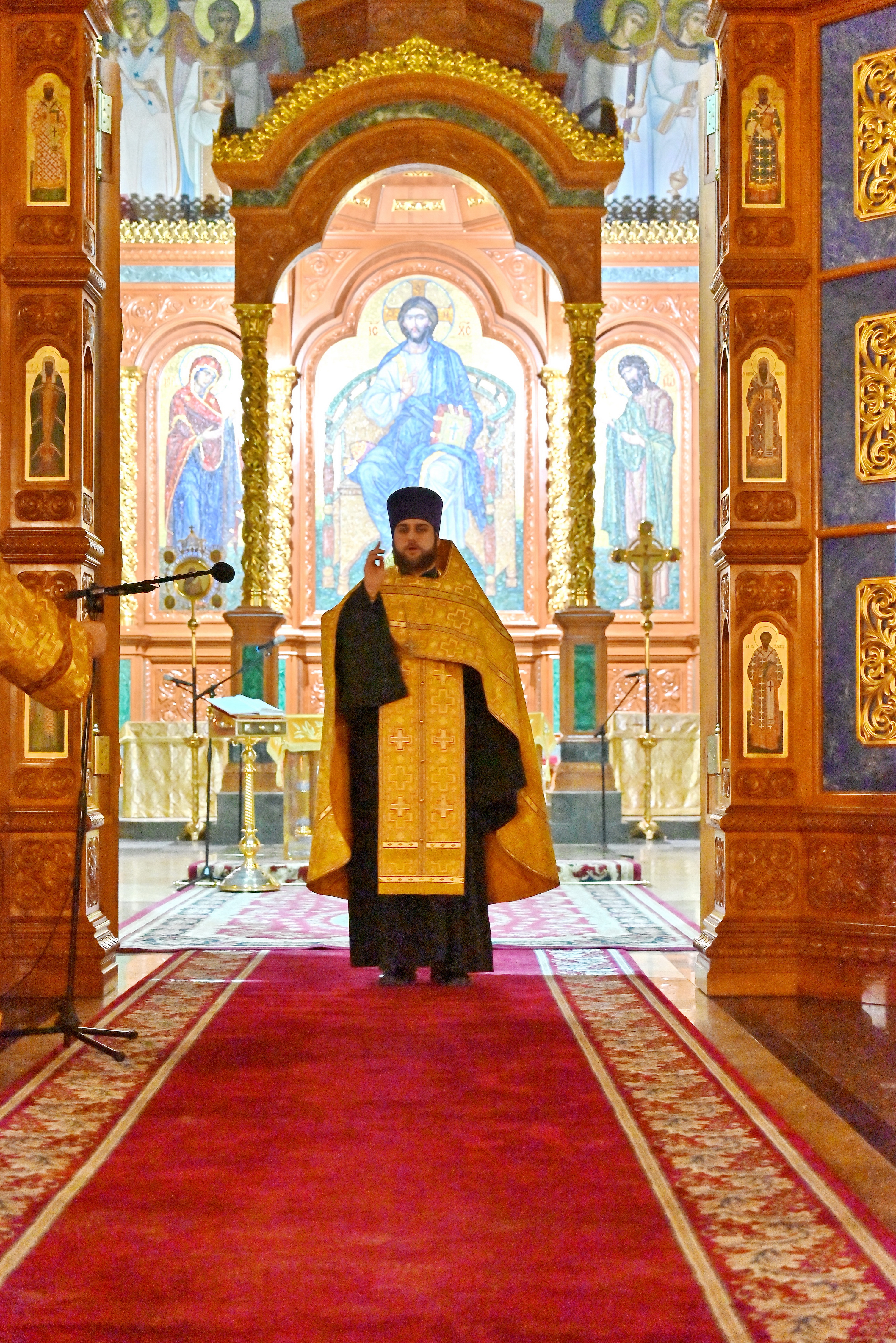 Богослужение возглавил архимандрит Серафим (Тищенко) . Его Высокопреподобию сослужили клирики собора.