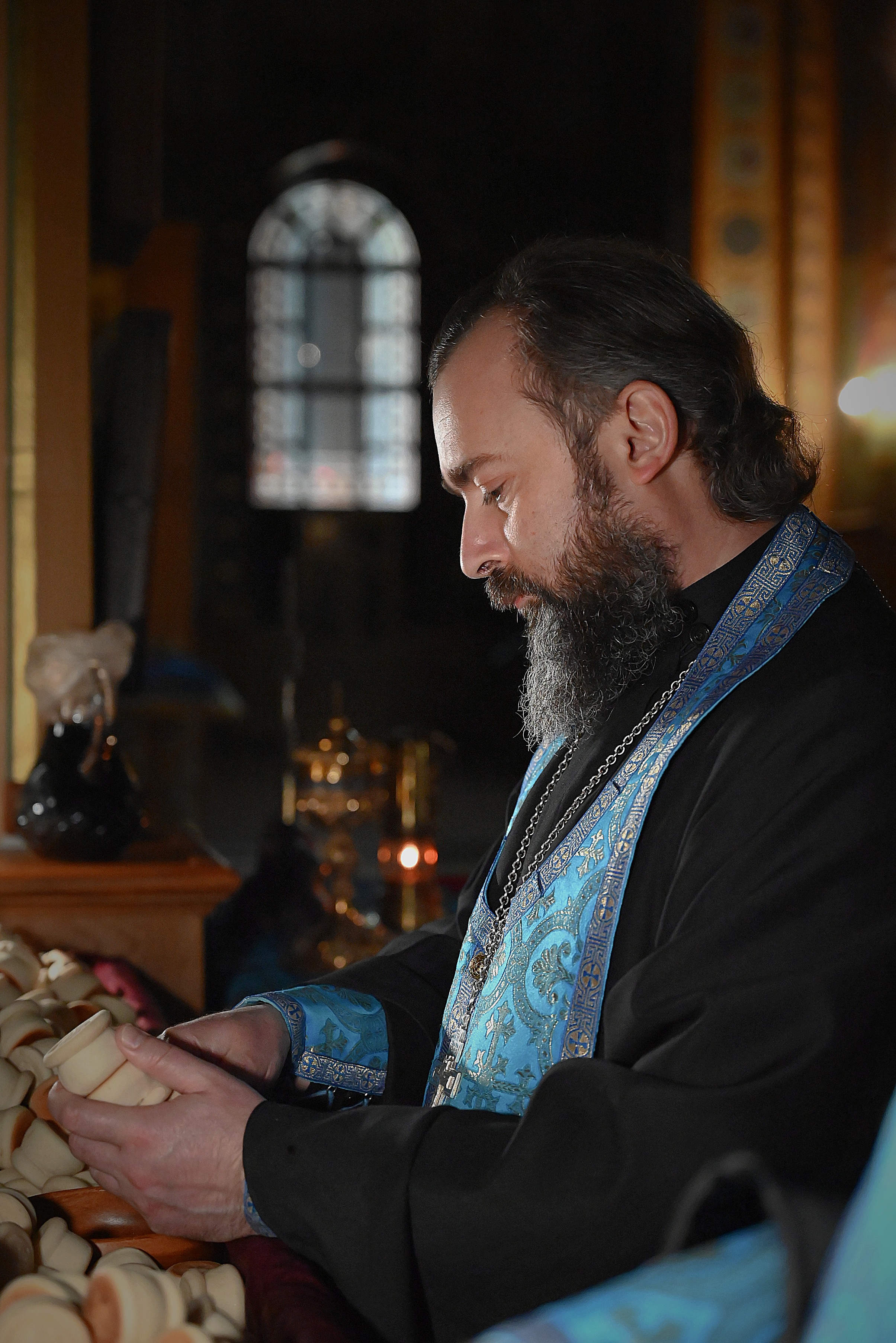 На Великой вечерне, в притворе храма, был совершен чин Литии с благословением пяти хлебов, пшеницы, вина и елея.